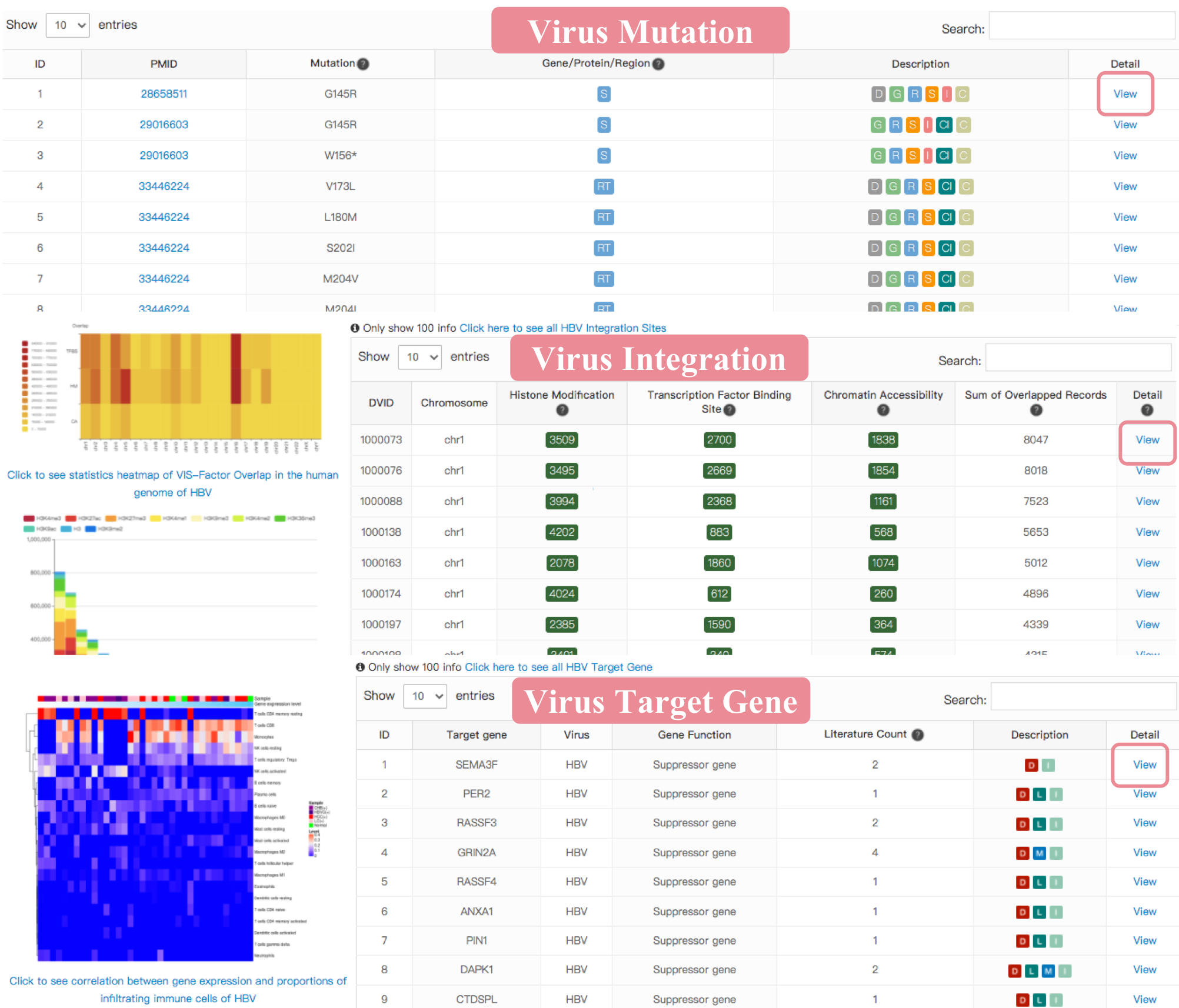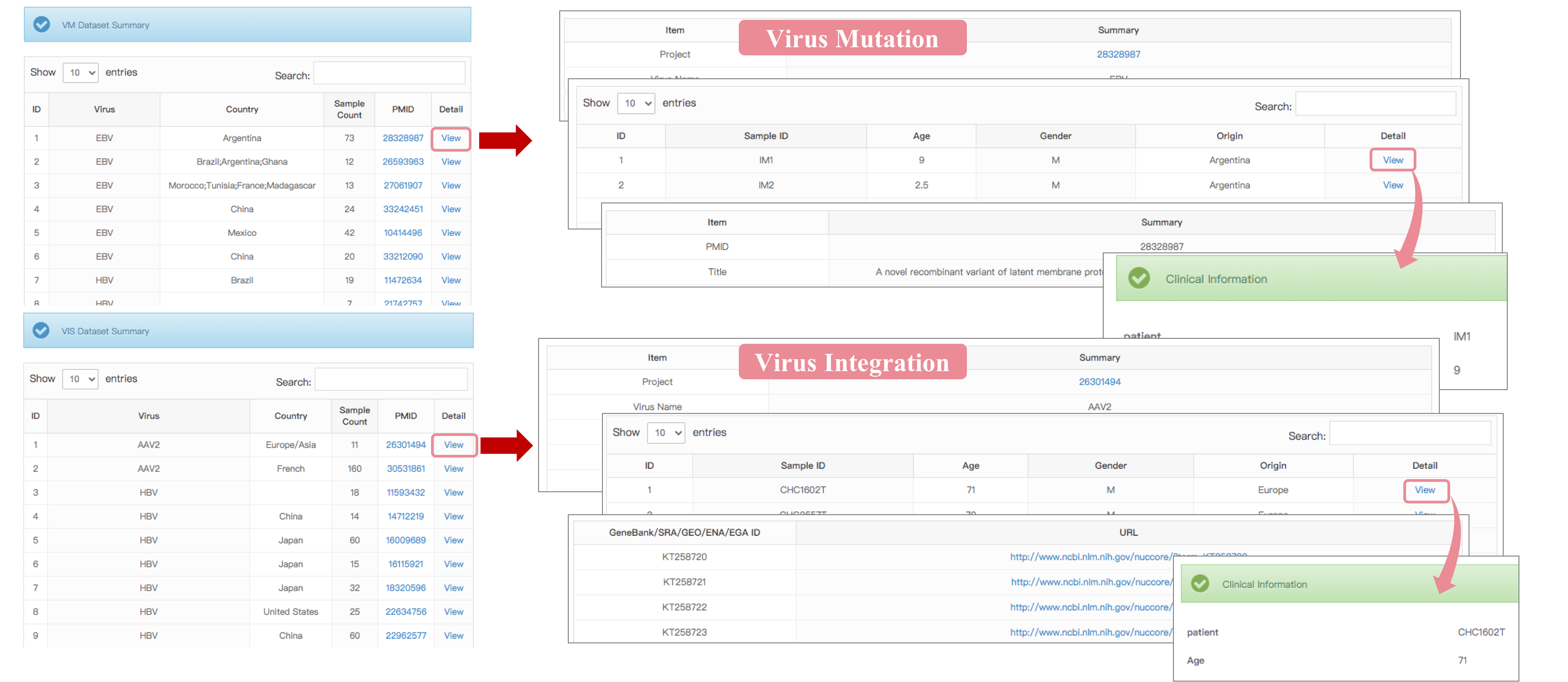 This page shows statistical charts and tables about descriptive clinical information for virus mutation and integration datasets. The user can click "View" to inspect detailed clinical information and some links for the sample.