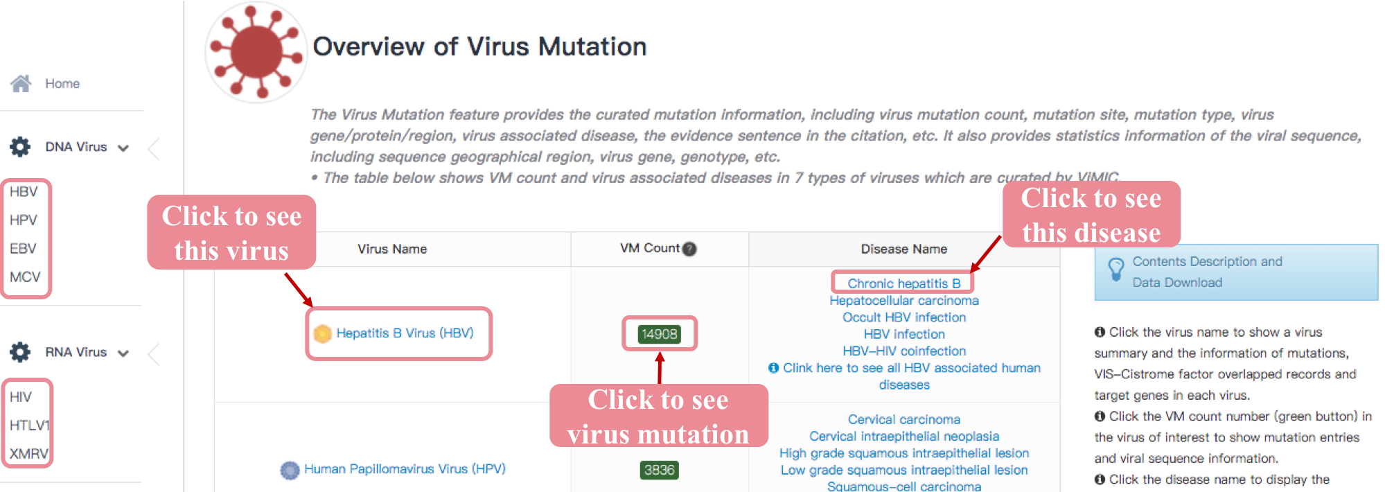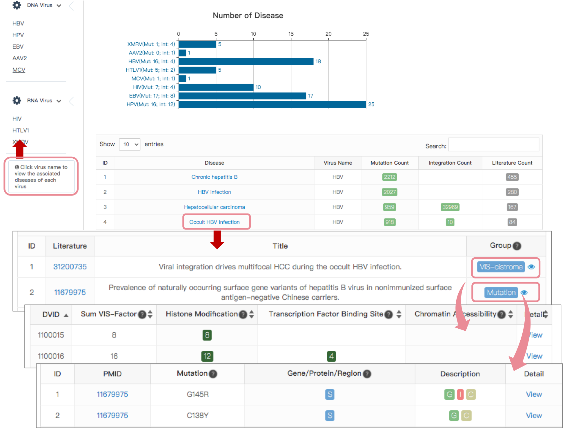 The Disease module provides the curated information in each type of virus related disease, including mutation, integration-cistrome and literature. Mutation count means the total number of virus mutation in virus associated diseases. Integration count means the total number of virus integration in virus associated diseases. Literature count means the total number of literature related to virus associated diseases.