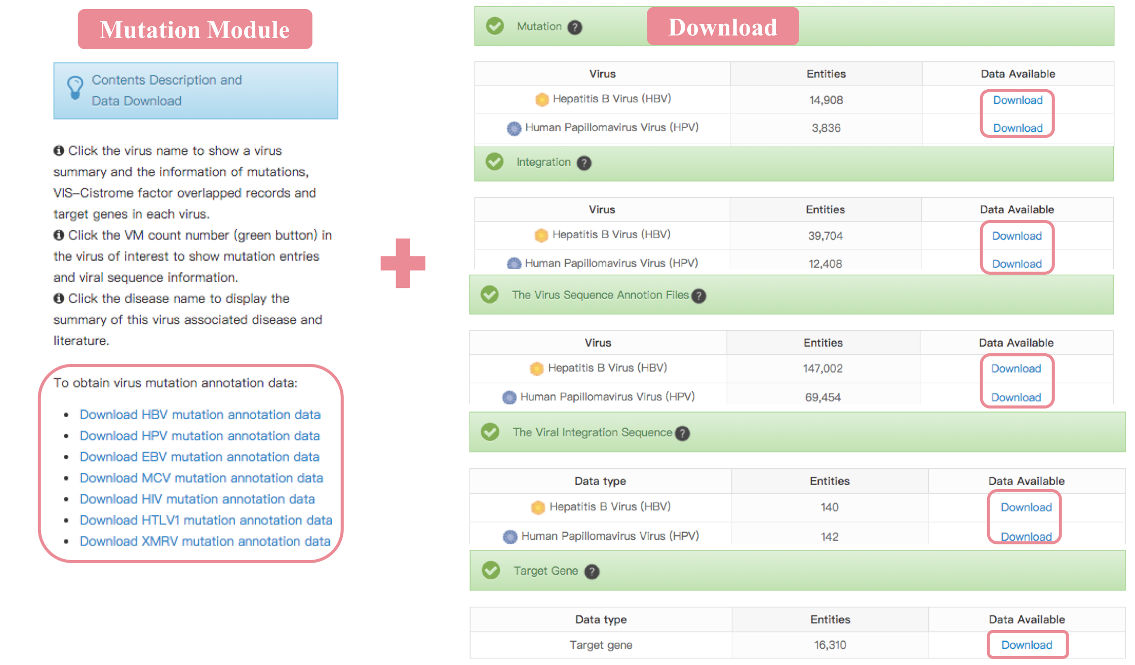 The ViMIC allows the user to download the various virus data files including mutation, integration, sequences and target gene. Meanwhile, users can directly download the related data files in the mutation, integration, target gene module pages or data download page.