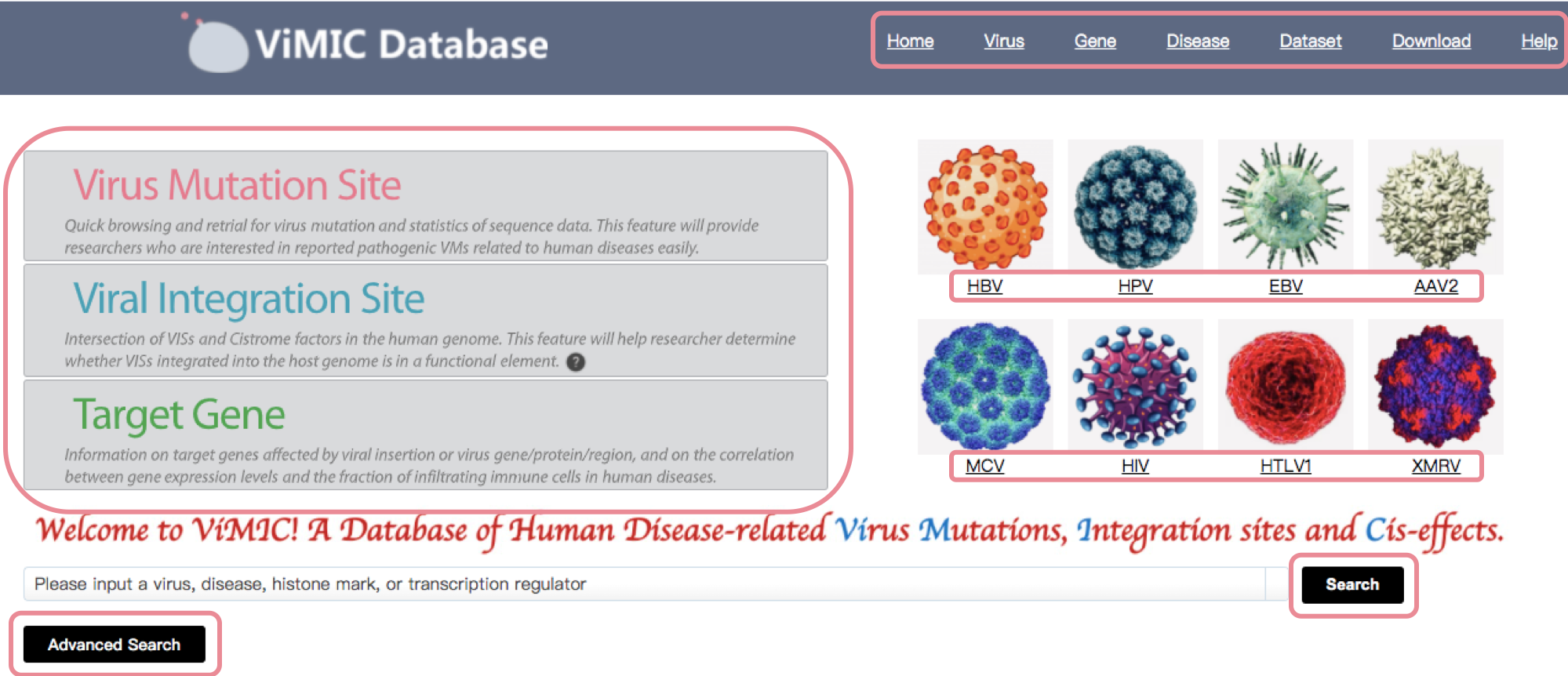 The homepage of ViMIC mainly gives a navigation of our database, including listing the modules of ViMIC on menu bar and upper left panel, providing three main features to help users to browse, search, analyze, visualize and download data. Main modules on upper left consist of virus mutation site, viral integration site and target gene. Other modules consist of Virus (virus information summary), Gene (target gene summary), Disease (virus infected disease summary), Dataset (virus related clinical dataset summary), Download (ViMIC data download) and Help (ViMIC help document).