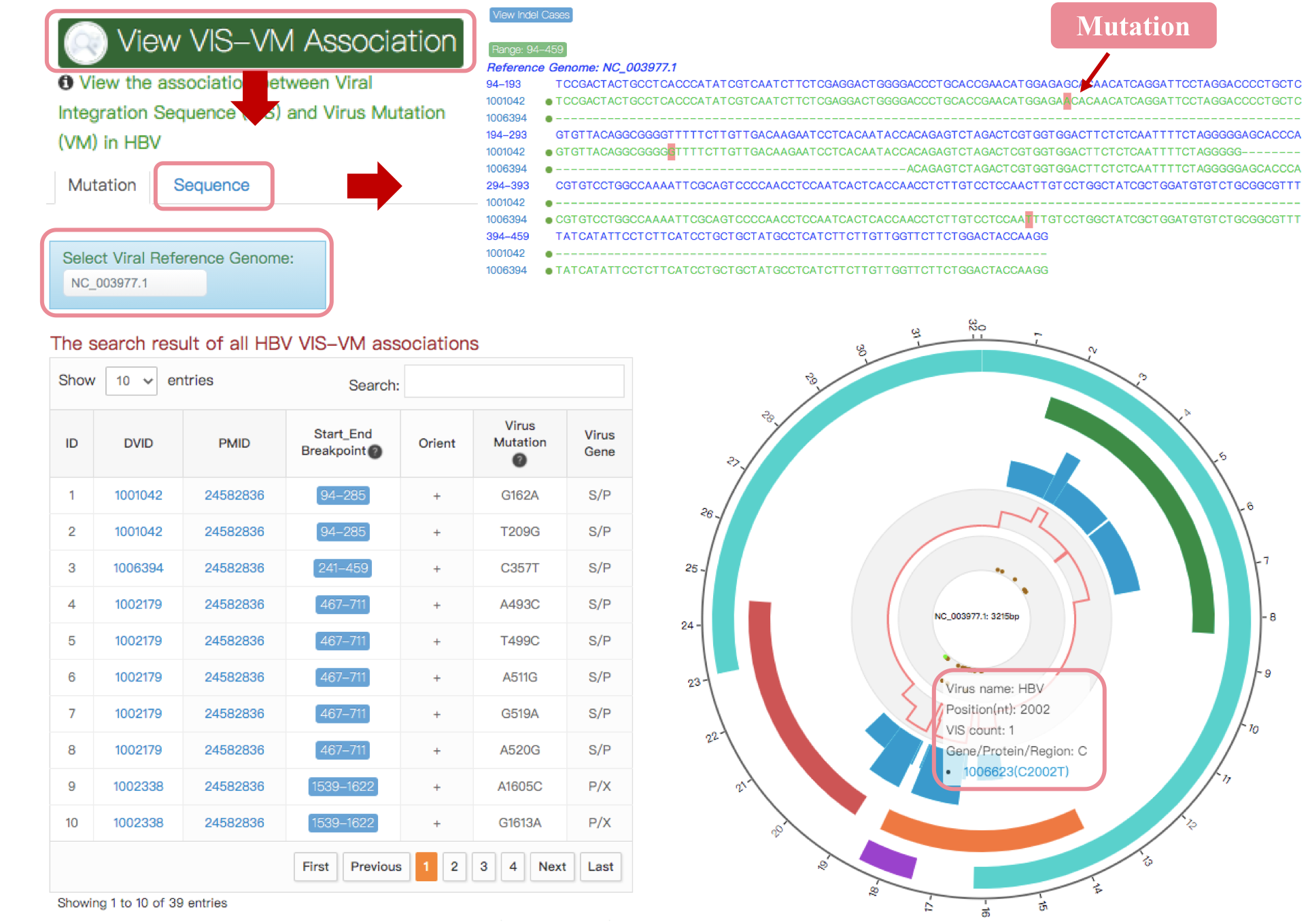 In the VIS-cistrome homepage of selected virus, users can click “View VIS-VM Association” to visualize mutations observed in VIS fragments. VISs of 3 viruses includes HBV, HPV and AAV2, with precise breakpoint coordinates and the reference genome in the integration literature, were used to map and visualize whether mutation occurred in VISs. Users can view the distribution of mutations harbored in VISs compared with the viral reference genome (e.g., NC_003977.1) sequence and downlaod all viral VIS-VM associations results. Users can click DVID to query the detailed information of the VIS. A virus genome plot on the right visualizes the distribution of VISs based on each viral reference genome. Move your mouse over the plot to view the region and VIS information. By clicking ‘Sequence’ button, users can view the sequence mapping of identify mutations harbored in each VIS.