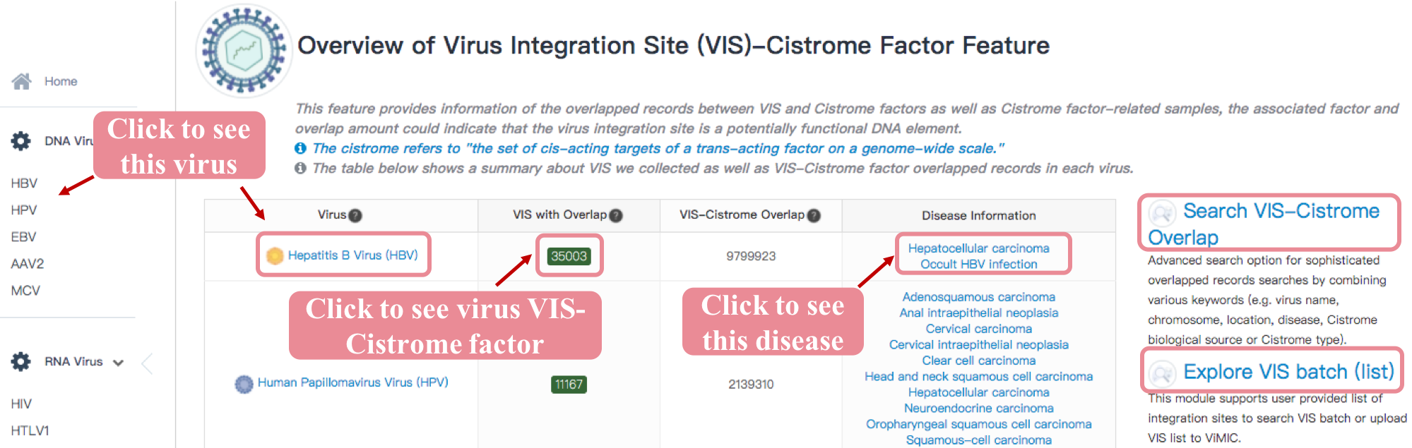 This feature provides information of the overlapped records between VIS and Cistrome factors as well as Cistrome factor-related samples, the associated factor and overlap amount could indicate that the virus integration site is a potentially functional DNA element. The cistrome refers to "the set of cis-acting targets of a trans-acting factor on a genome-wide scale." The table below provide virus navigation and VIS-cistrome data statistics which summaries about VIS we collected as well as VIS-Cistrome factor overlapped records in each virus. Click virus name to view virus overview of virus mutation, integration and target gene. Click VIS count number (green button) to view VIS-Cistrome factor data. Click Disease Information to display the summary of this disease and disease related literature. The user can click "Search VIS-Cistrome Overlap" to Search Overlapped Records of Interest page with saerch engine for saerching overlapped records of interest according to disease, biological resource (cell line, cell type, tissue type) and other selections. Click "Explore VIS batch (list)" to search VIS batch or upload VIS list to ViMIC.