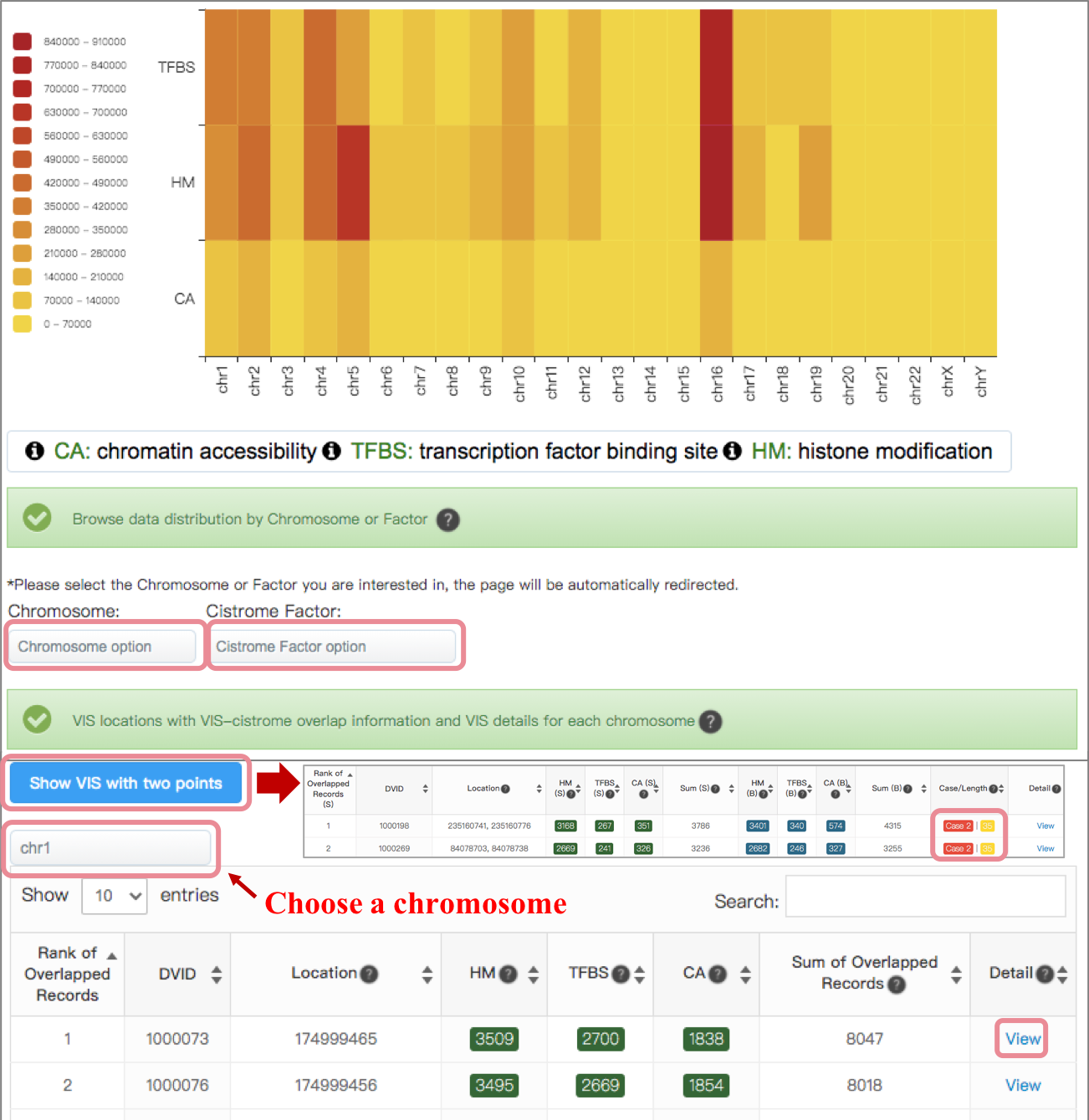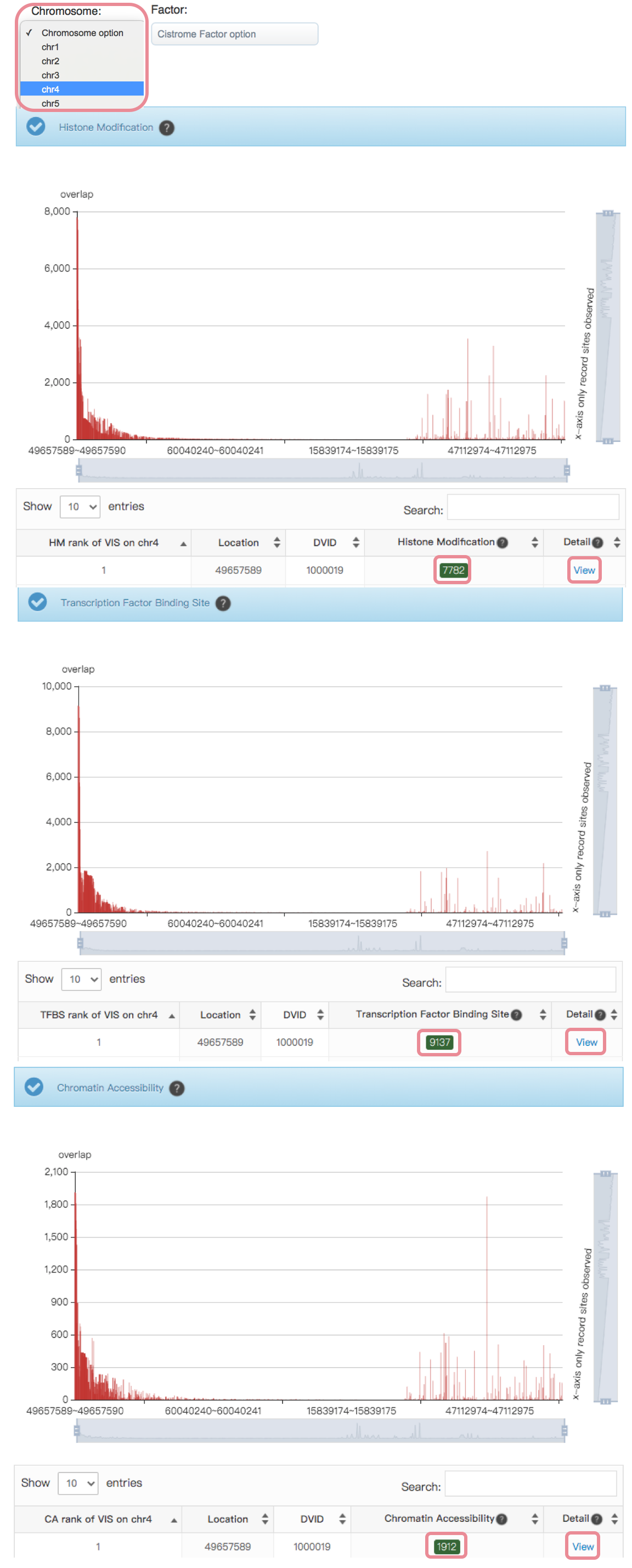 This table shows VIS locations with VIS-cistrome overlap information for each chromosome. When selecting the chromosome of interest, users can browse VIS information which indicates the numbers of VIS and three cistrome factors’ overlapped records. Click ‘View’ button to show the detailed information of selected VIS.