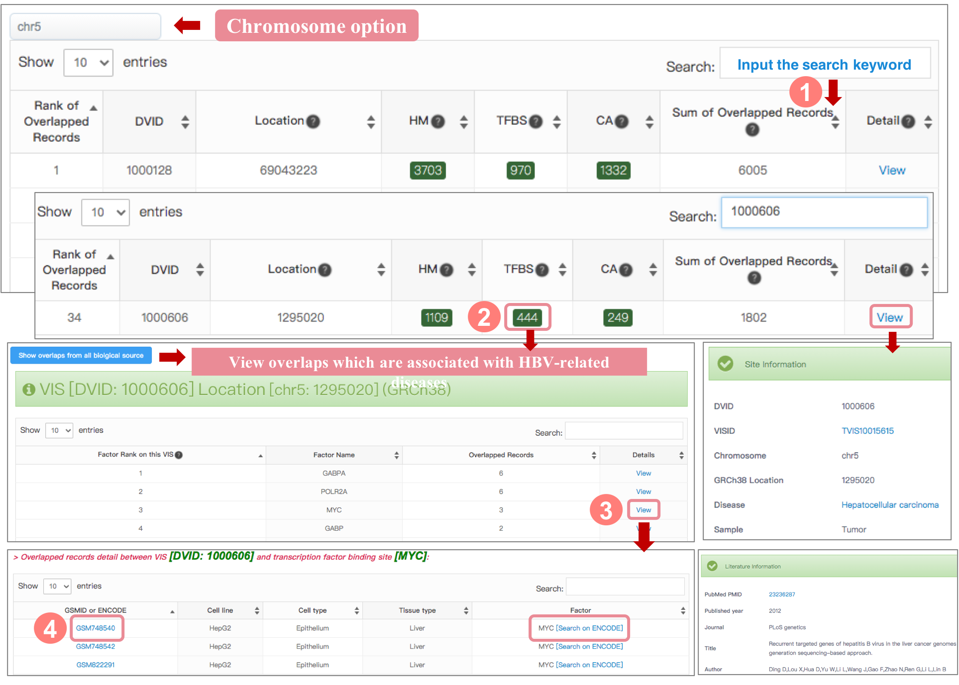 1. We take the entry of “1000606” on chromosome 5 in HBV as an example. After users click the “chr5” and search the entry of “1000606” in HBV VIS-Cistrome Factor Overlap in each human chromosome page, ViMIC shows the overlaps result of three cistrome factors. The user can click green button to view VIS-Cistrome Factor Overlapped Record Details related to selected VIS, in addition, the user can inspect some other VIS detail information such as disease and literature by clicking "View" button at Detail column.