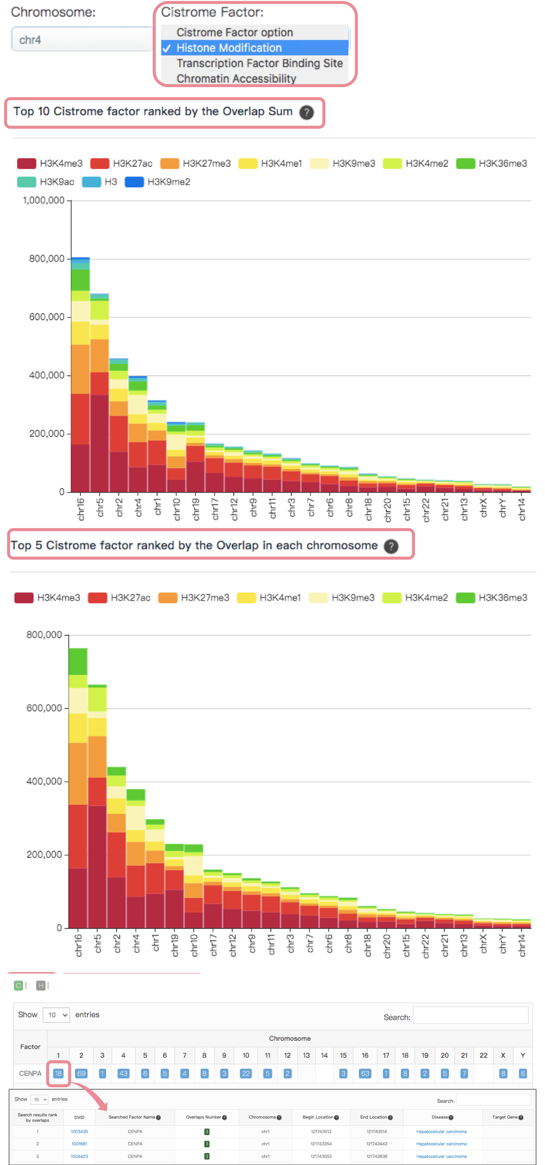 The user can browse HBV VIS-Cistrome factor overlapped records data by specific chromosome or statistics histogram for specific Cistrome factor when click the chromosome or Cistrome factor the user is interested in.