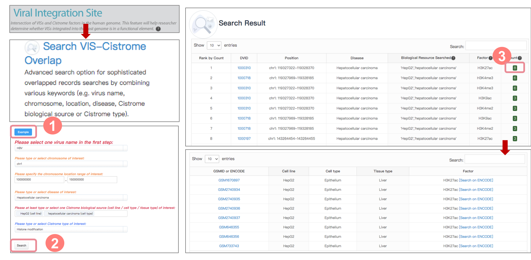 This search module can help users search and filter the overlapped records of interest according to various keywords (e.g., virus name, chromosome, location, disease, Cistrome biological source or Cistrome type). Specifically, the user can combining keywords of related disease and biological resource to filter out overlpped records of interest. ViMIC will then return a factor grouped table containing overlapped records which meet all selected options that the user is interested in.