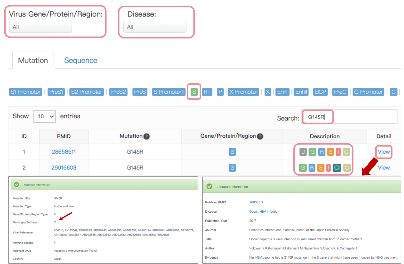 When selecting the virus gene of interest, users can quickly search the keyword of interest in the search box on the top-right of the table. Click the "View" button to show the detail information of this mutation.