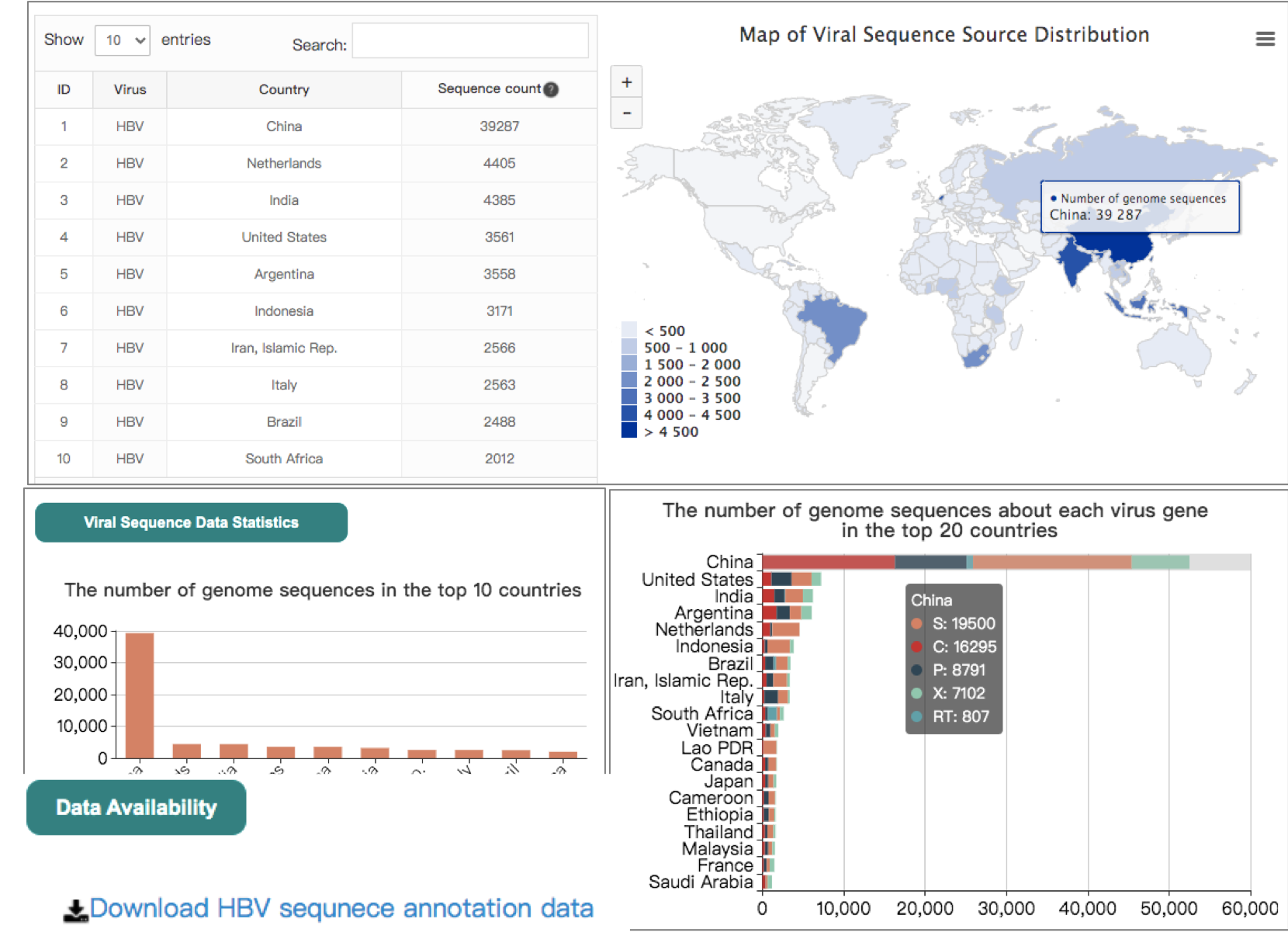 The Viral Sequence module provides the geographical distribution of the source, viral gene, region and genotype of virus sequences. Users can browse the statistical data and download the annotation information to quickly obtain the sequence GeneBank IDs of interest.