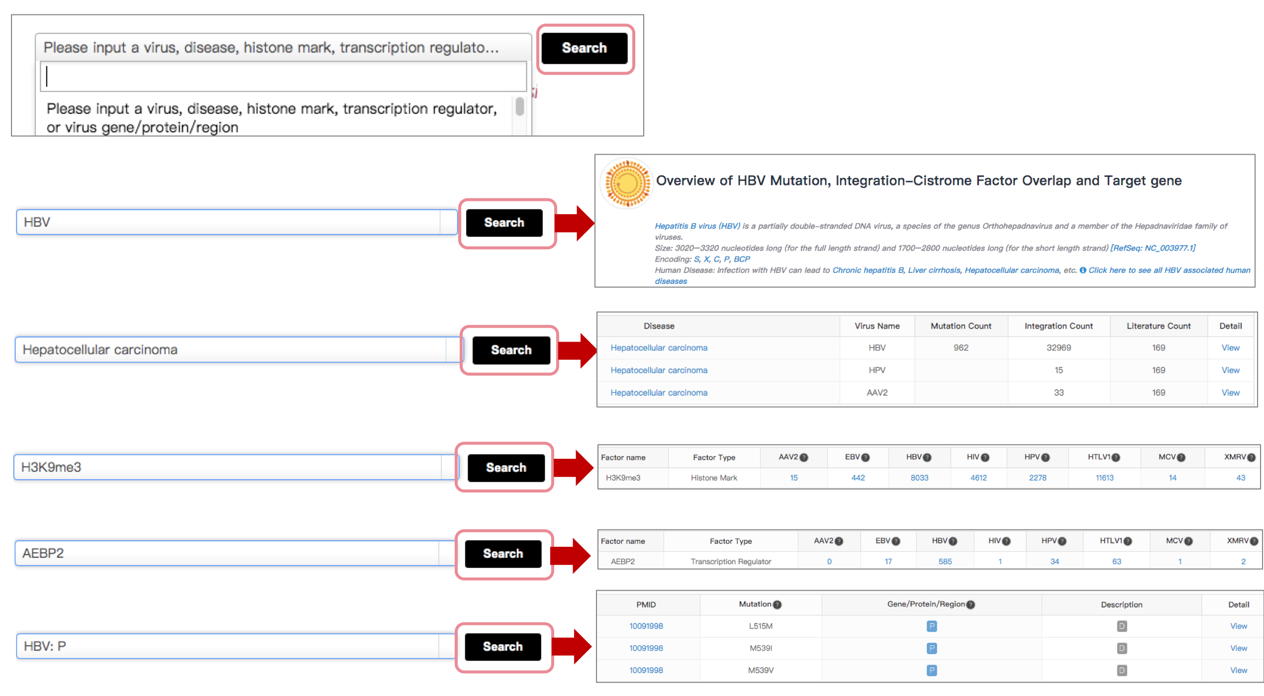 Input the virus name, disease, histone mark, transcription regulator or gene/protein/region directly in the search box at homepage, poping out a window about results of searched words.