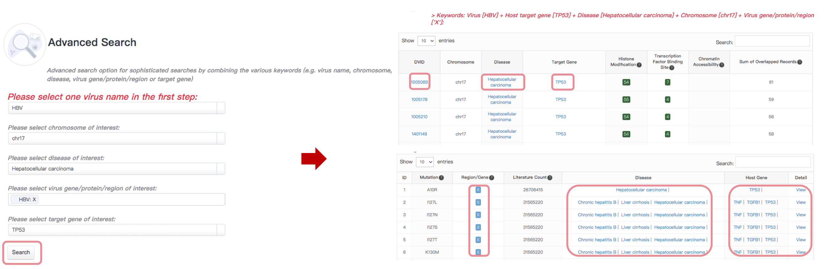 Advanced search is available for sophisticated searches by combining the various keywords (Virus, Mutation Site, Virus Gene/Protein/Region, Disease, Chromosome, Fragment) when user click Advanced Search on the left side of the homepage. Advanced search option for sophisticated searches by combining the various keywords (e.g., virus name, chromosome, virus gene/protein/region or target gene).