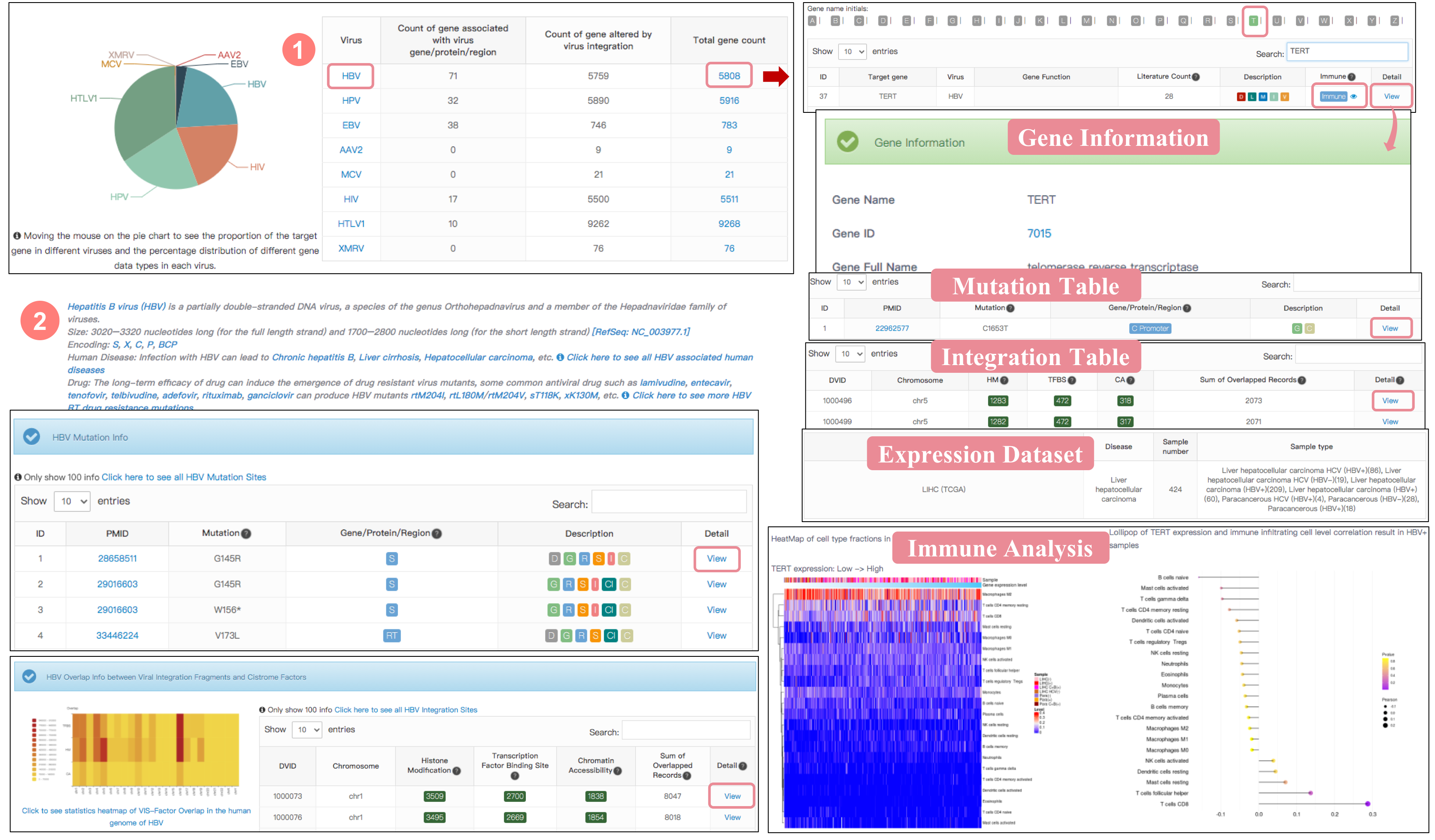 Gene information mainly shows gene name, gene id, gene type, resources' ID, etc, tow table (the integration table and gene expression dataset table) and immune analysis plot. The integration table: if previous studies reported that target gene was altered by virus integration events, the overlap between VISs in this literature and Cistrome factors was listed in the table. The gene expression dataset table lists the information of gene expression file from GEO or TCGA which contain the targetgene expression data, including data ID, disease, sample number and sample type.