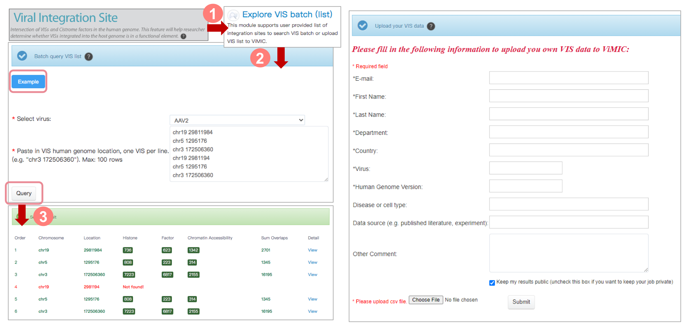This module supports user provided list of integration sites to search VIS batch or upload VIS list to ViMIC. The result will be notified by email once the job is completed if an email address has been provided.