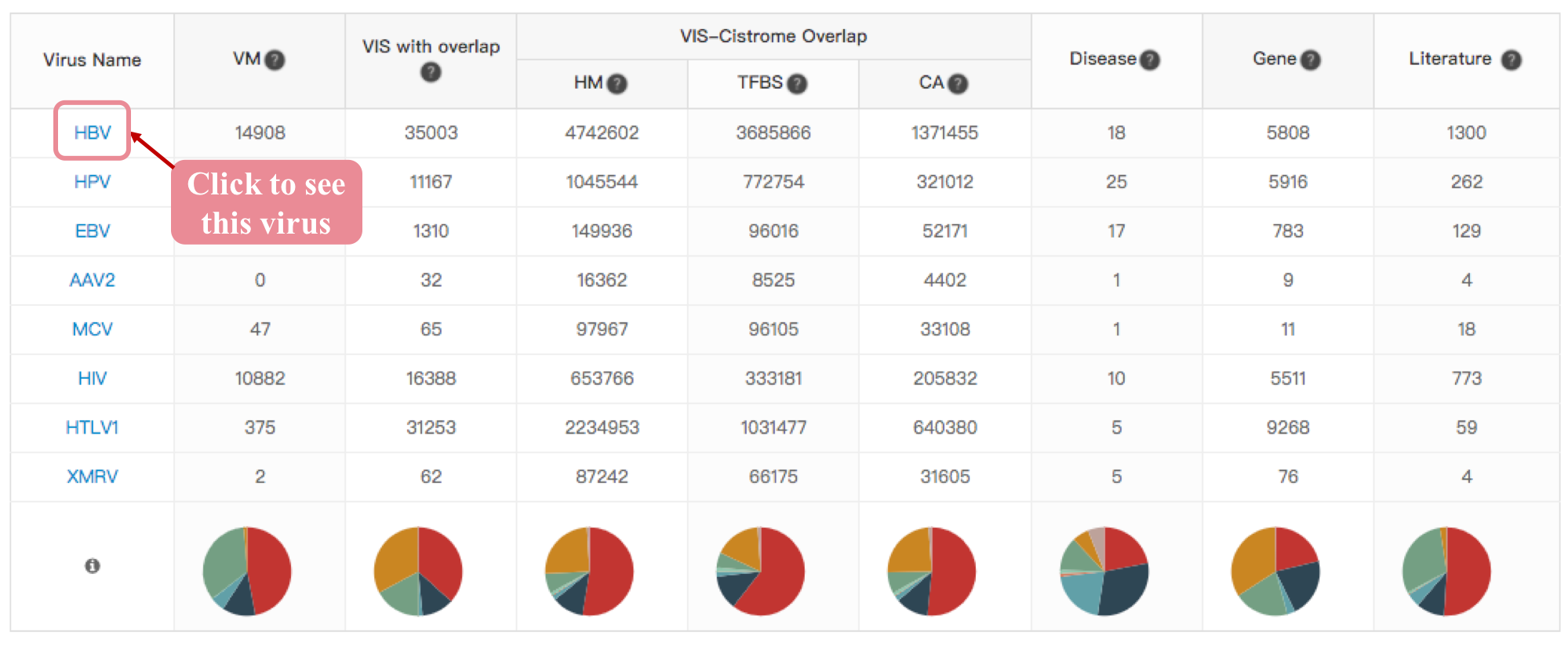 The Virus module provides an interface of each virus with a summary and links to three ViMIC features to help users easy to query research questions on VMs, VISs-Factors overlap or target genes, the table below shows the detailed count of each statistical type, click the virus name in table to see the overview of HBV mutation, integration-cistrome and target gene.