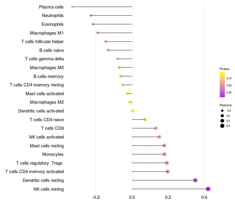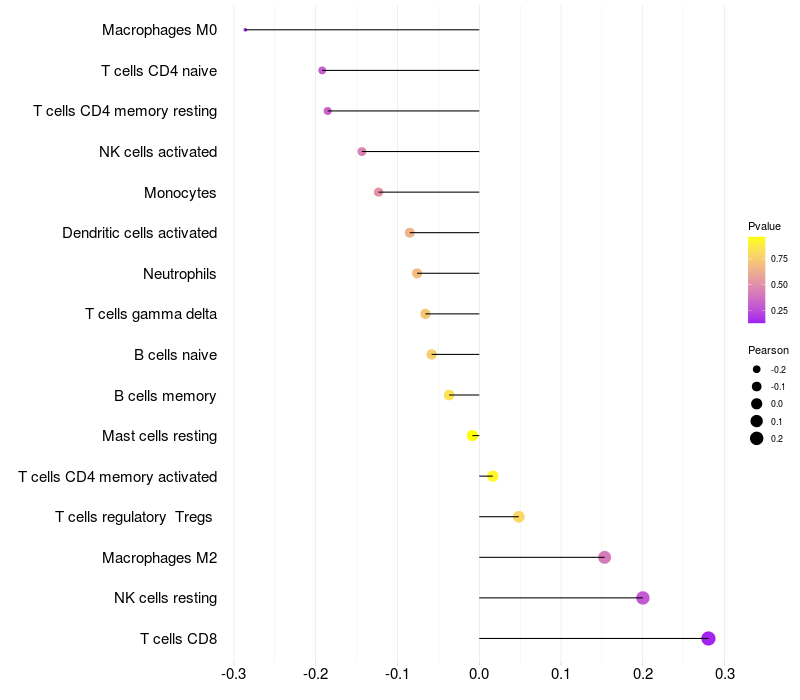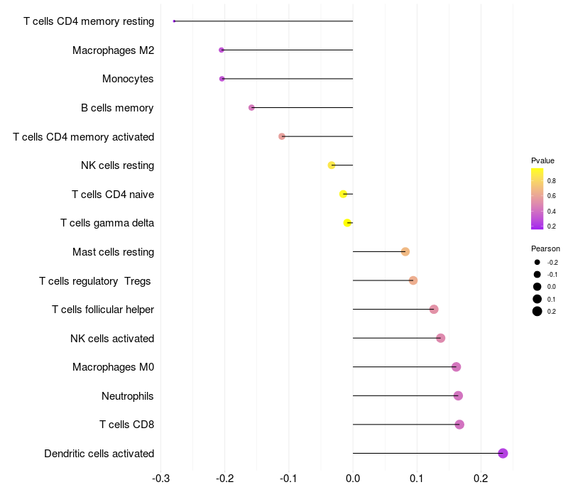 Lollipop of A4GNT expression and immune infiltrating cell level correlation result in HTLV1+ samples