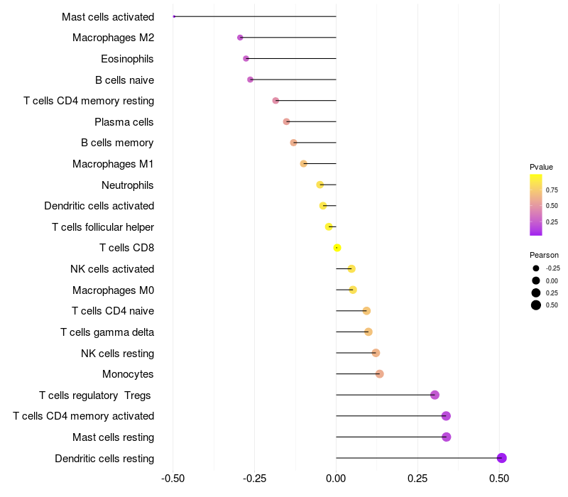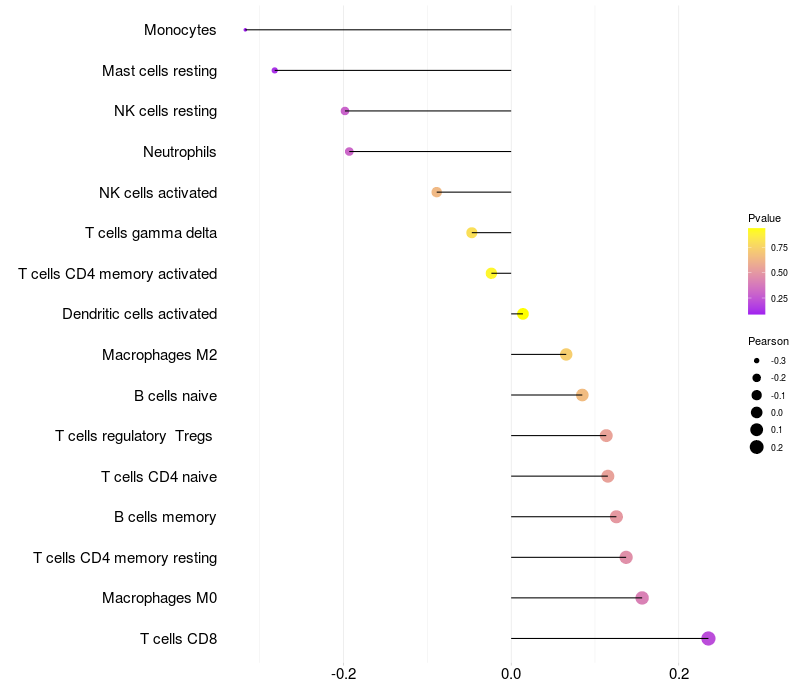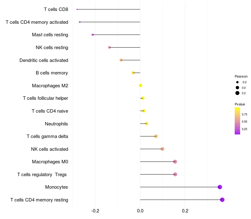 Lollipop of AADAT expression and immune infiltrating cell level correlation result in HTLV1+ samples