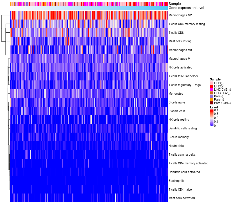 Liver hepatocellular carcinoma HCV (HBV+)(86), Liver hepatocellular carcinoma HCV (HBV-)(19), Liver hepatocellular carcinoma (HBV+)(209), Liver hepatocellular carcinoma (HBV+)(60), Paracancerous HCV (HBV+)(4), Paracancerous (HBV-)(28), Paracancerous (HBV+)(18) |