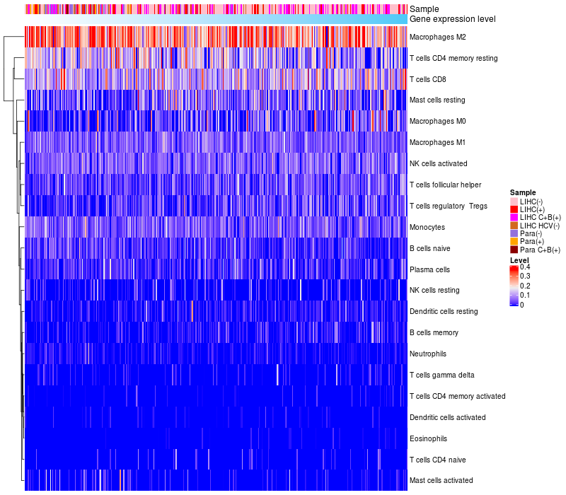 Liver hepatocellular carcinoma HCV (HBV+)(86), Liver hepatocellular carcinoma HCV (HBV-)(19), Liver hepatocellular carcinoma (HBV+)(209), Liver hepatocellular carcinoma (HBV+)(60), Paracancerous HCV (HBV+)(4), Paracancerous (HBV-)(28), Paracancerous (HBV+)(18) |
