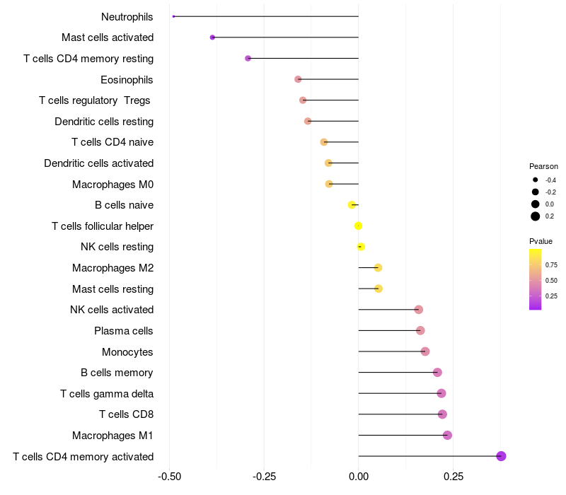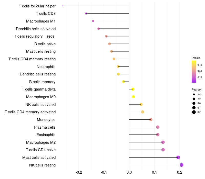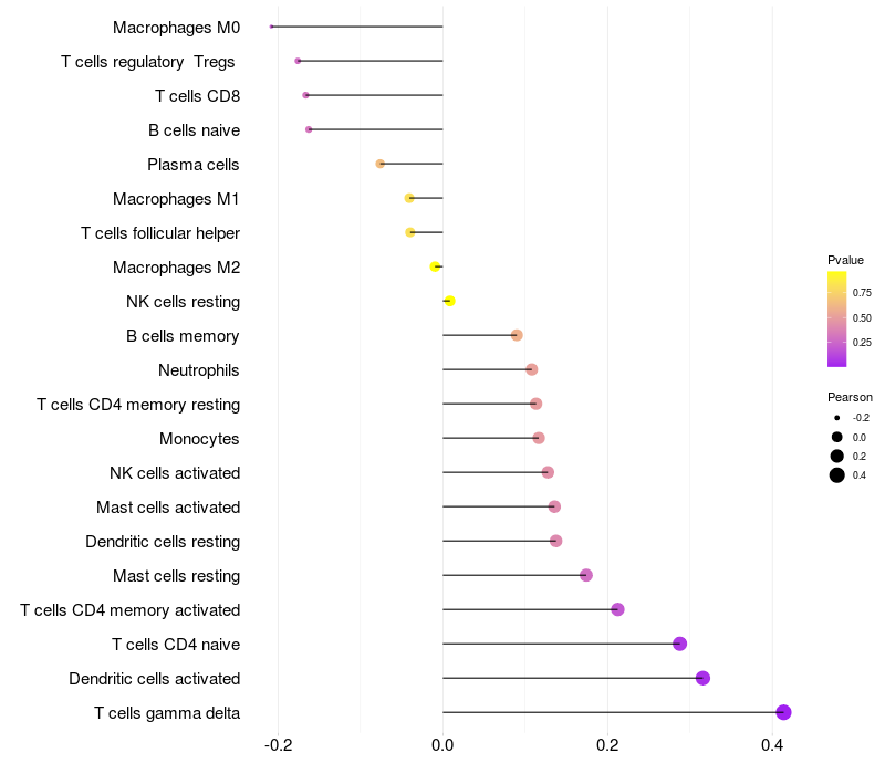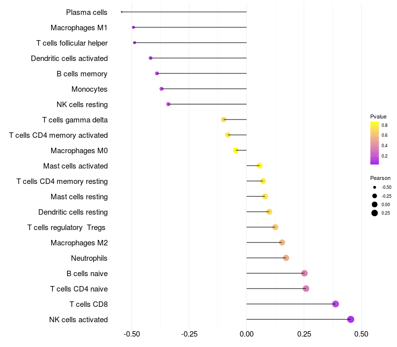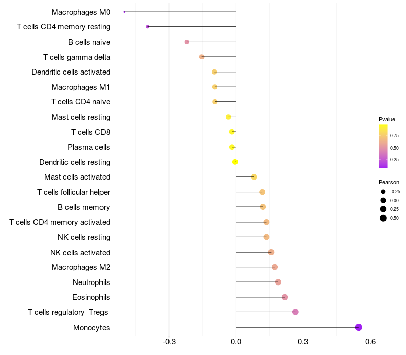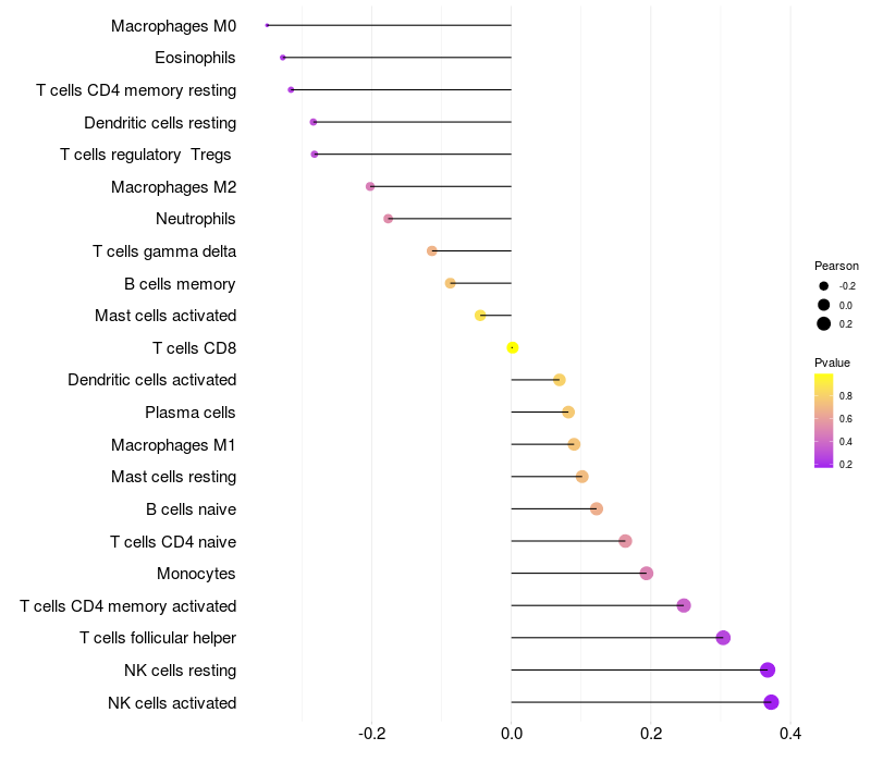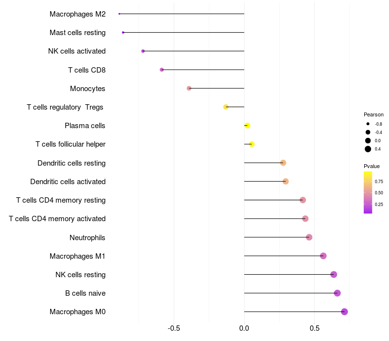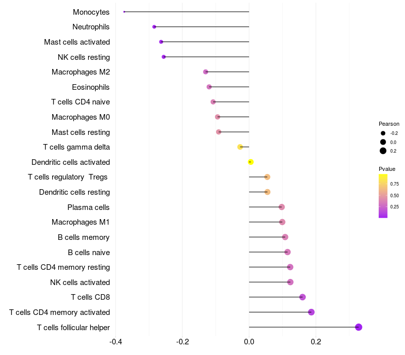 Lollipop of ABHD3 expression and immune infiltrating cell level correlation result in HPV+ samples
