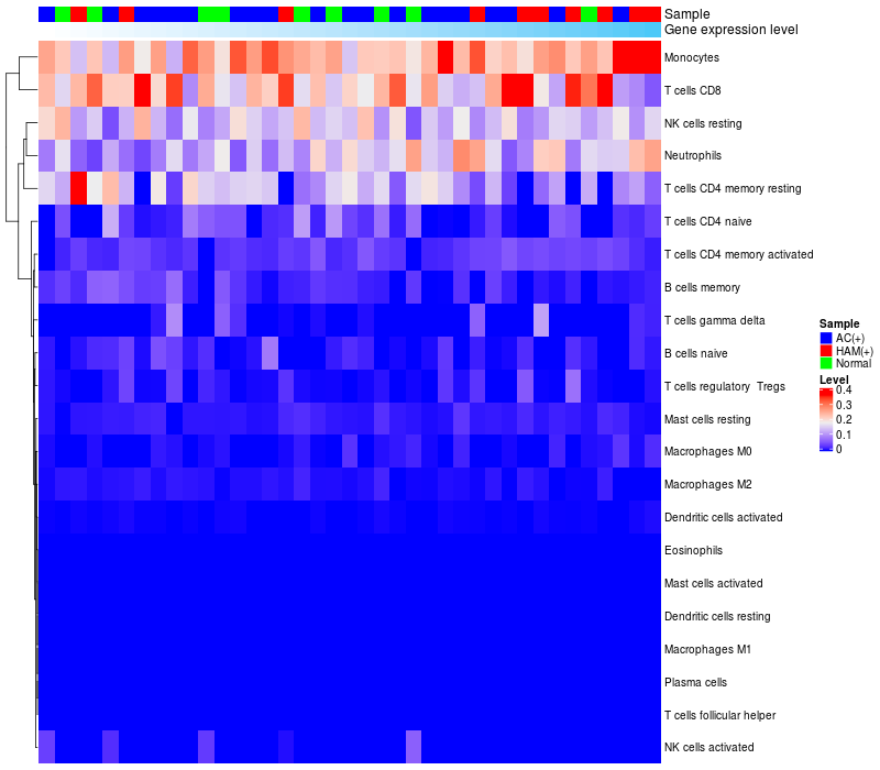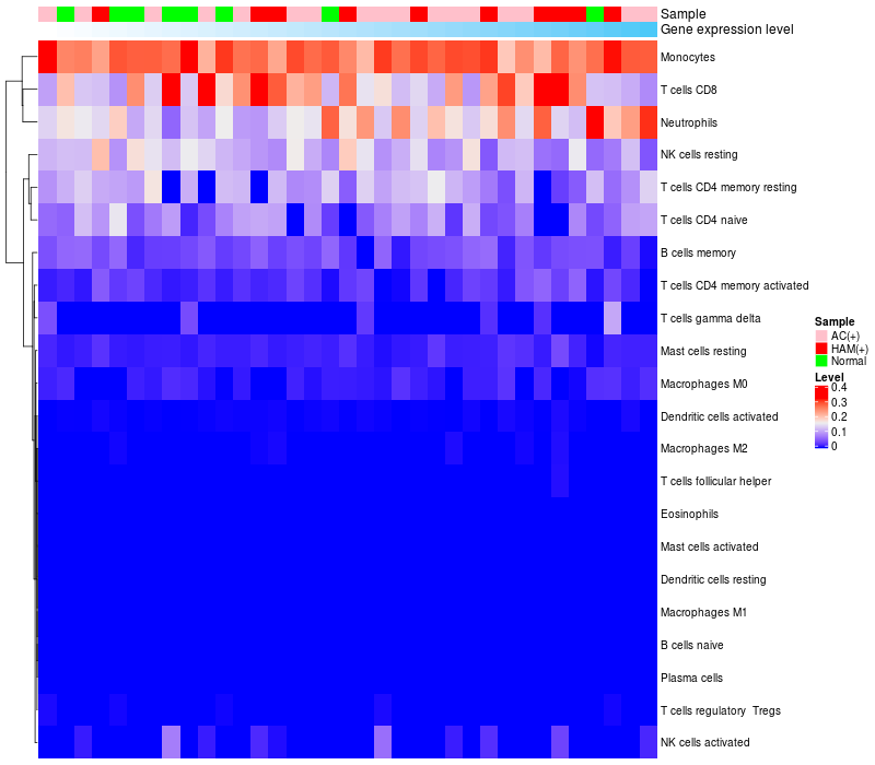 Normal (8), Asymptomatic carriers (HTLV1+)(17), HTLV-1-associated myelopathy (HTLV1+)(10) |