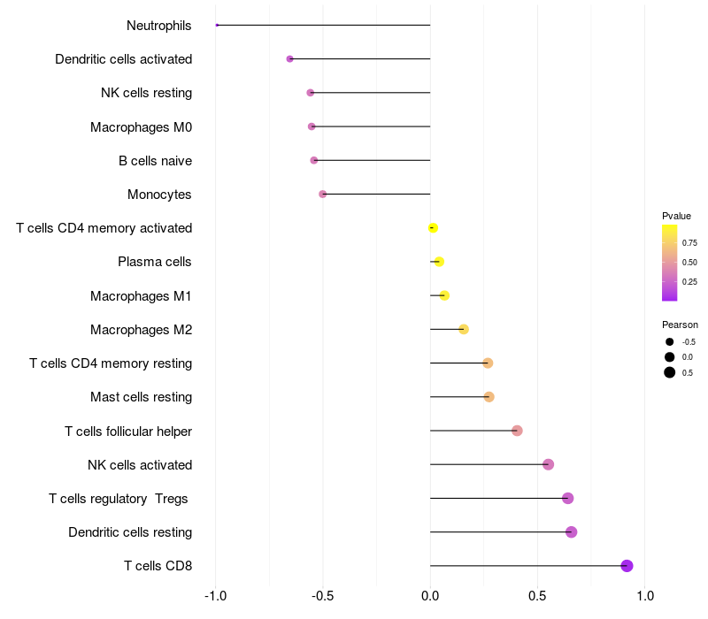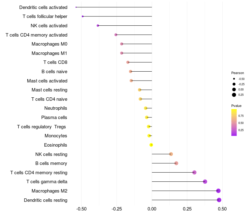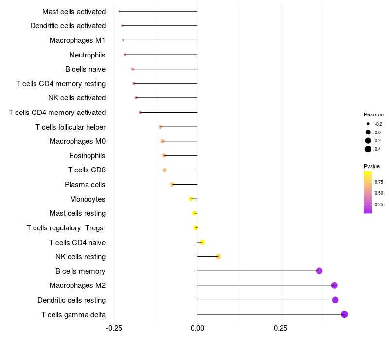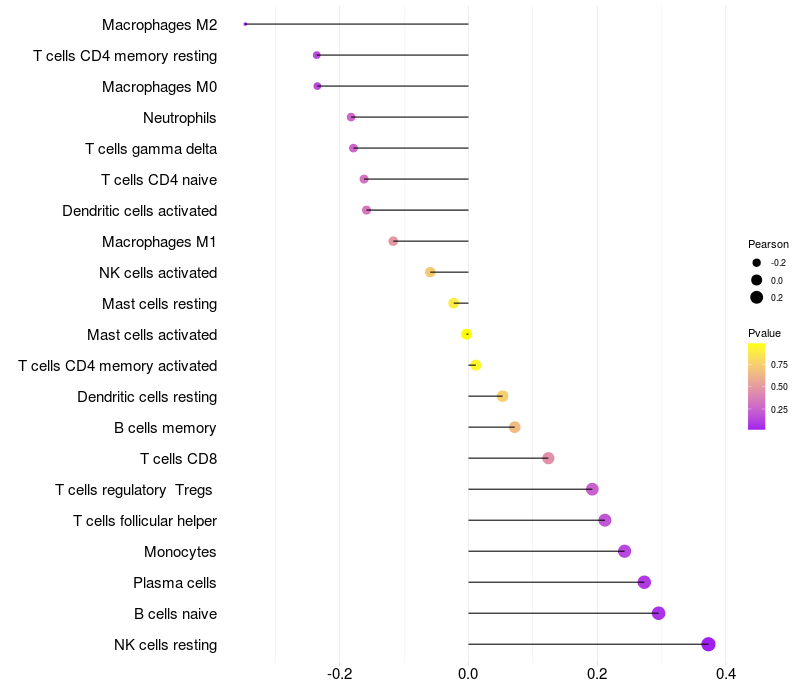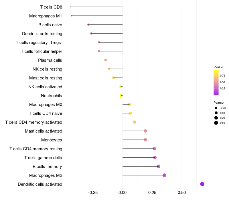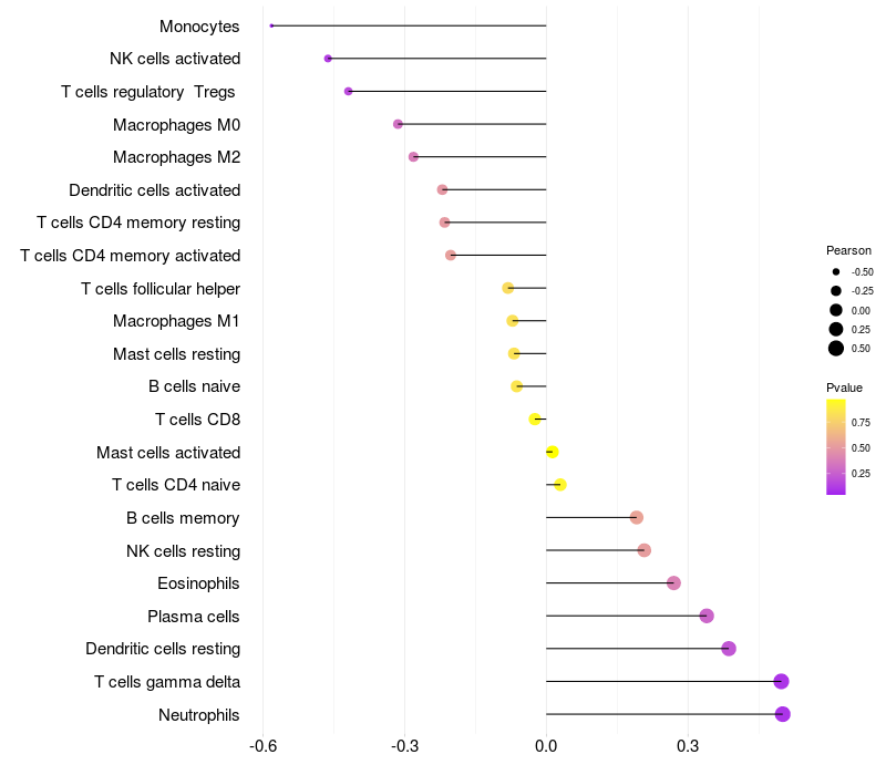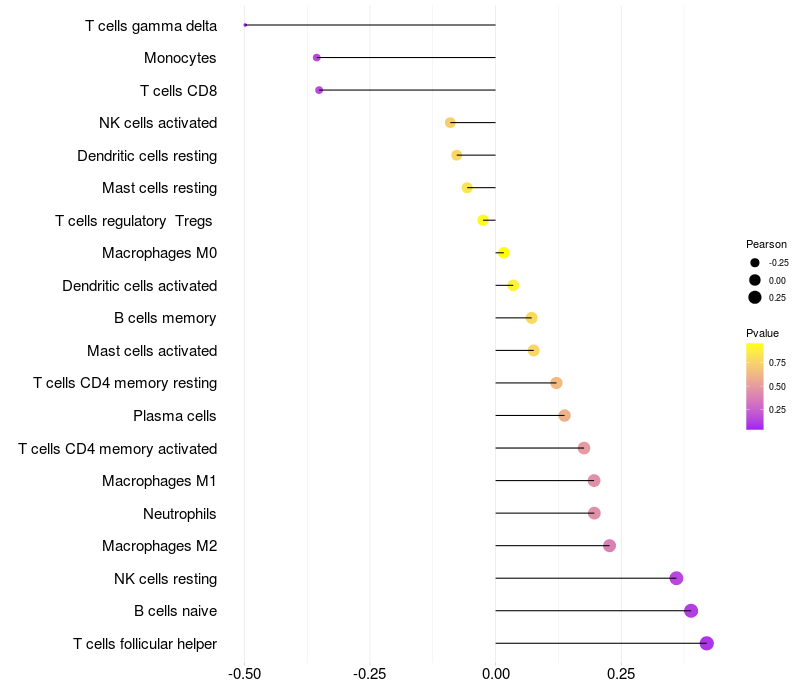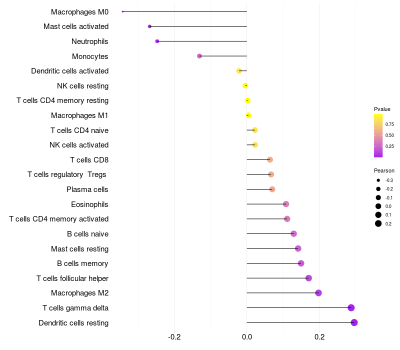 Lollipop of ACYP2 expression and immune infiltrating cell level correlation result in HPV+ samples
