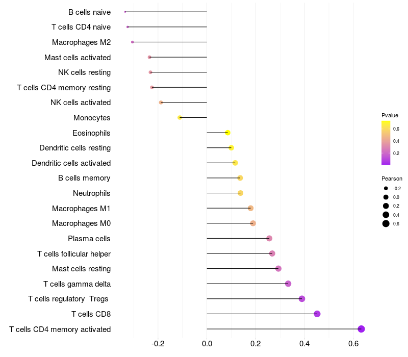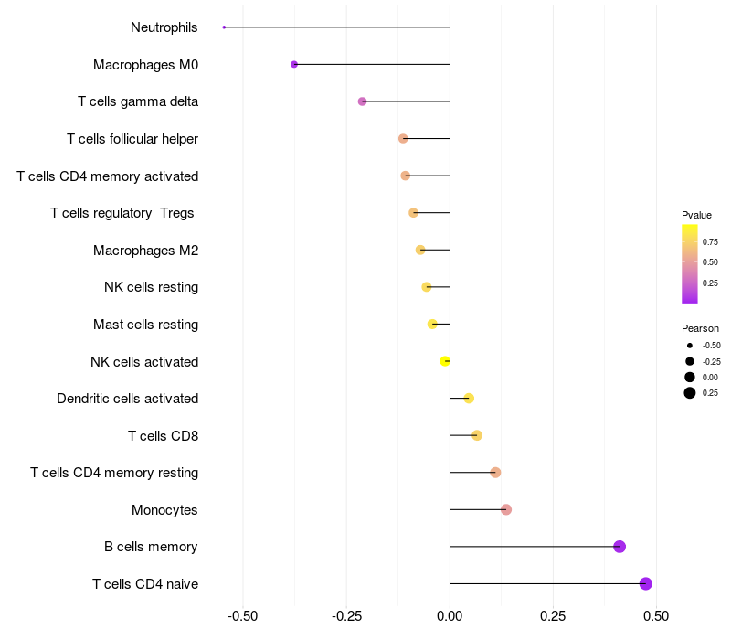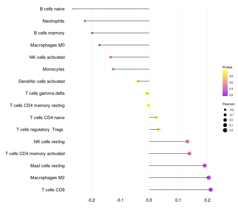 Lollipop of AFAP1L2 expression and immune infiltrating cell level correlation result in HTLV1+ samples