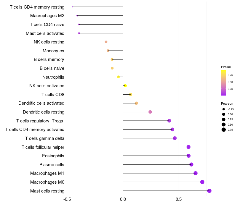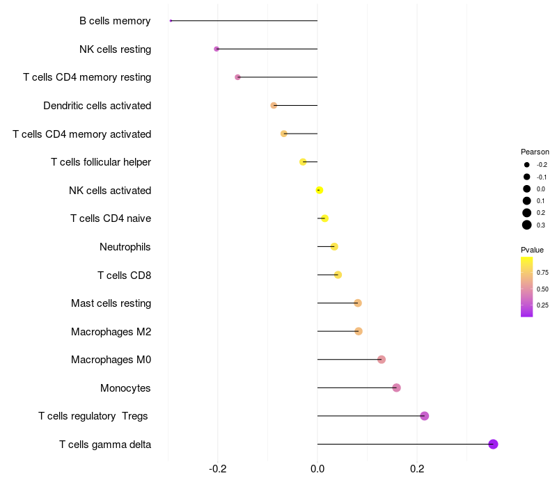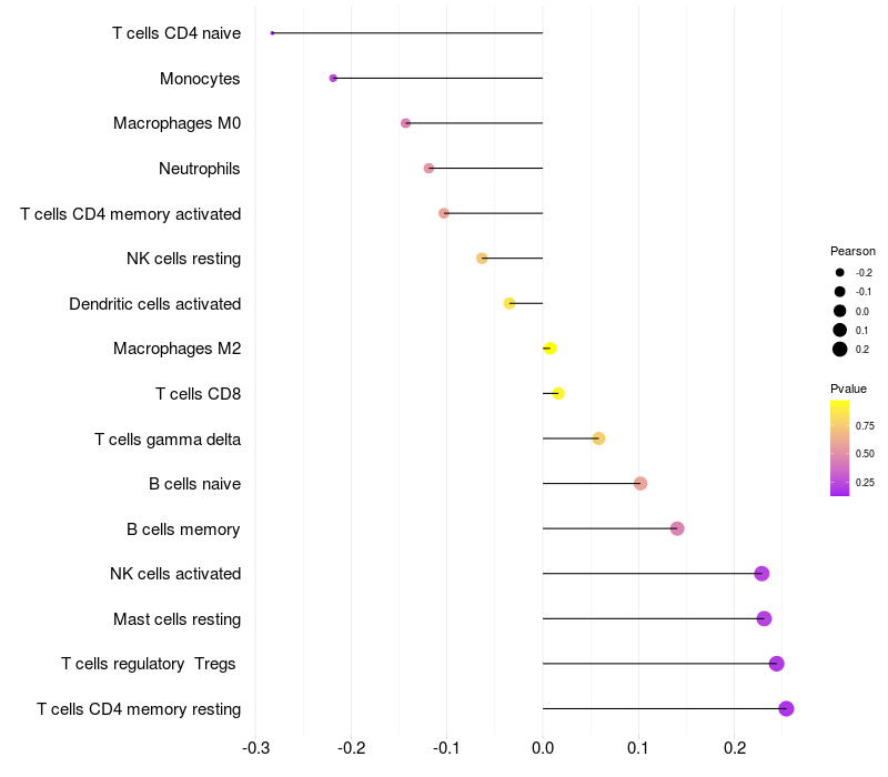 Lollipop of AFTPH expression and immune infiltrating cell level correlation result in HTLV1+ samples