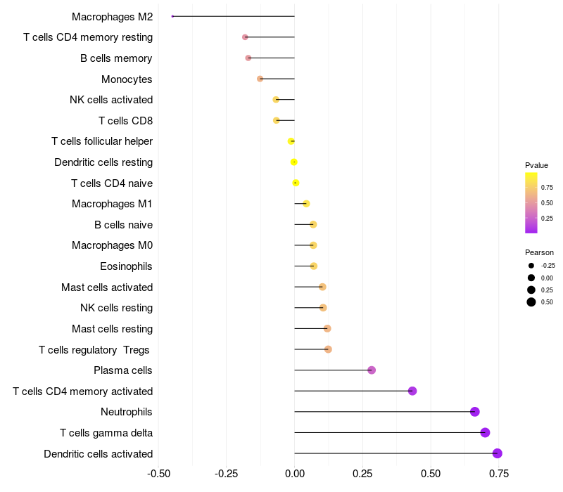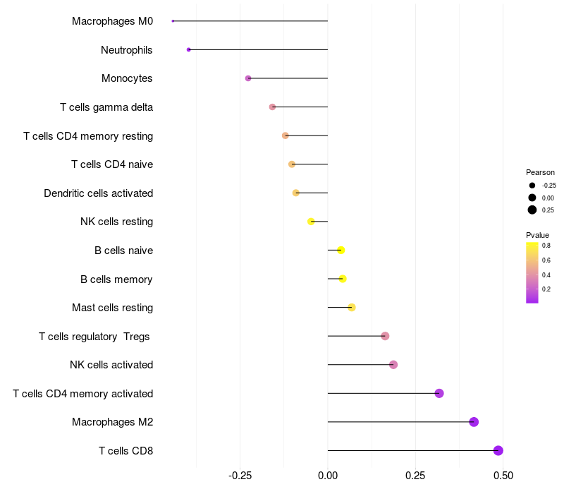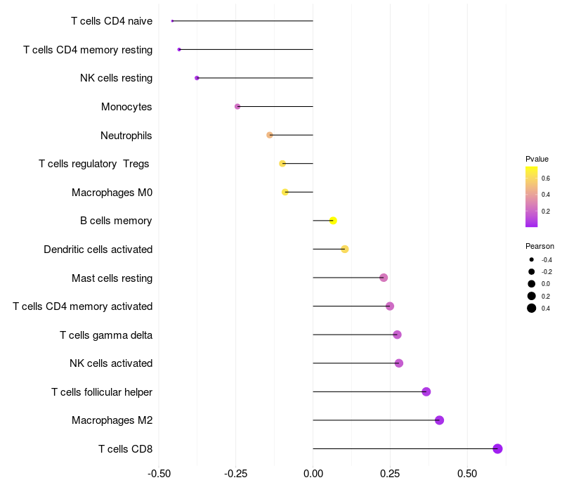 Lollipop of AGA expression and immune infiltrating cell level correlation result in HTLV1+ samples
