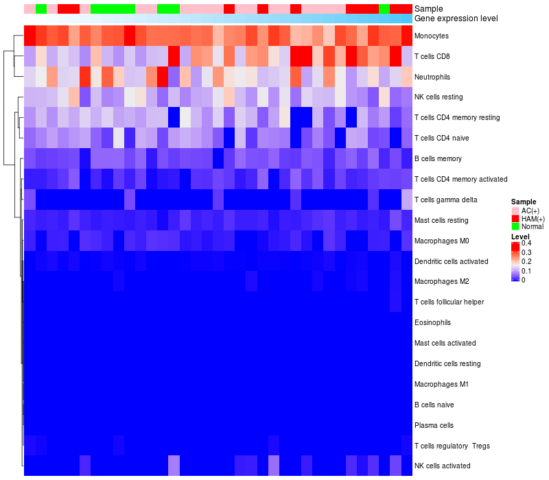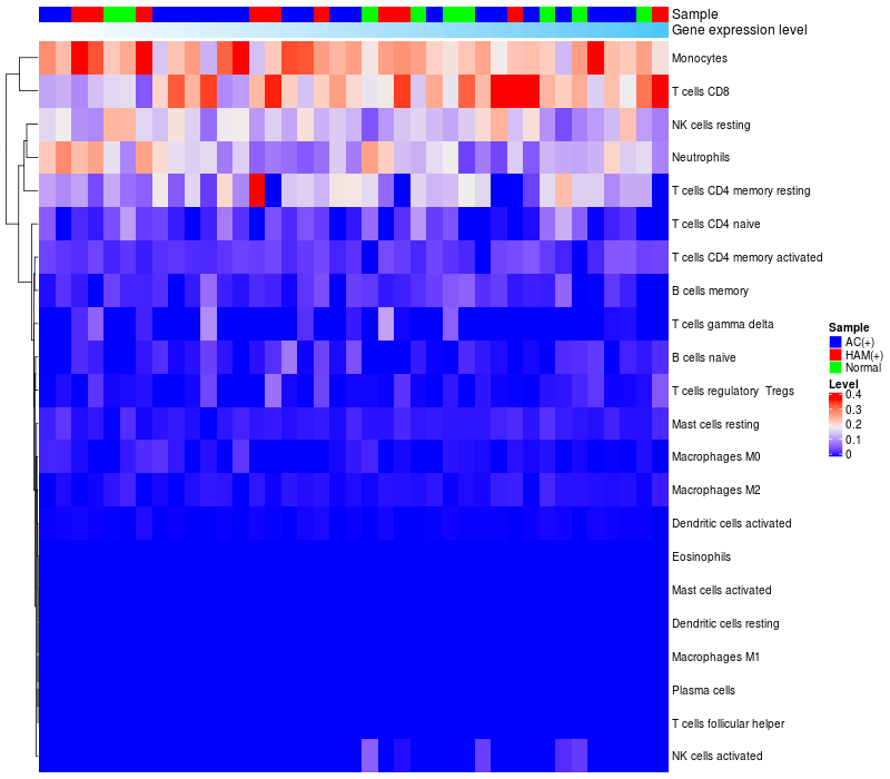 Normal (8), Asymptomatic carriers (HTLV1+)(17), HTLV-1-associated myelopathy (HTLV1+)(10) |