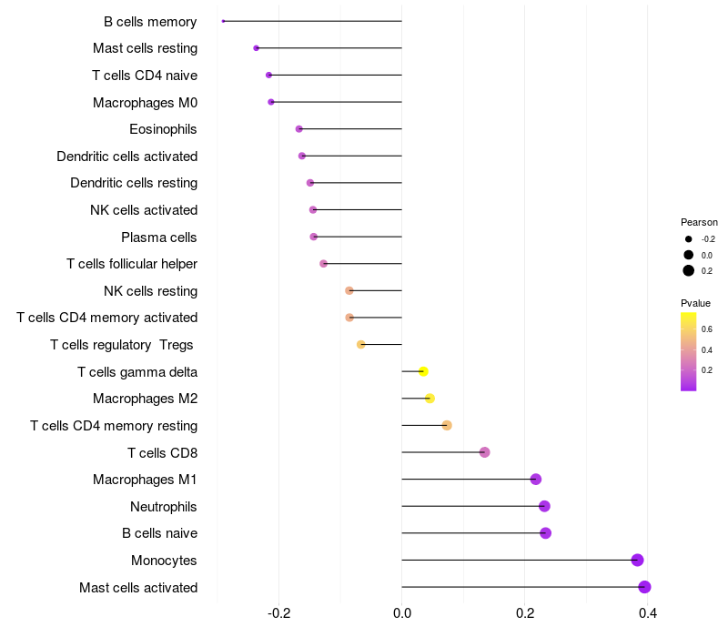 Lollipop of AGTR1 expression and immune infiltrating cell level correlation result in HBV+ samples