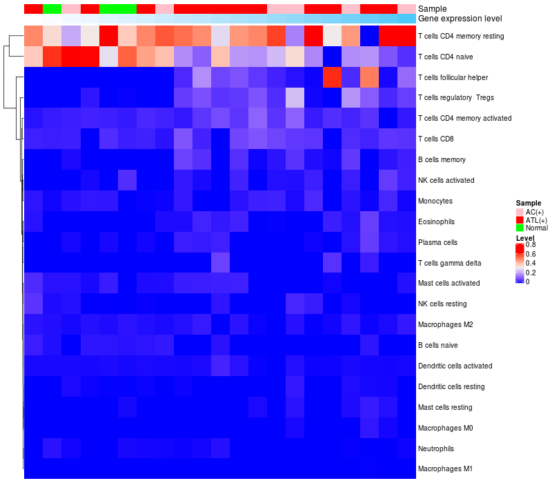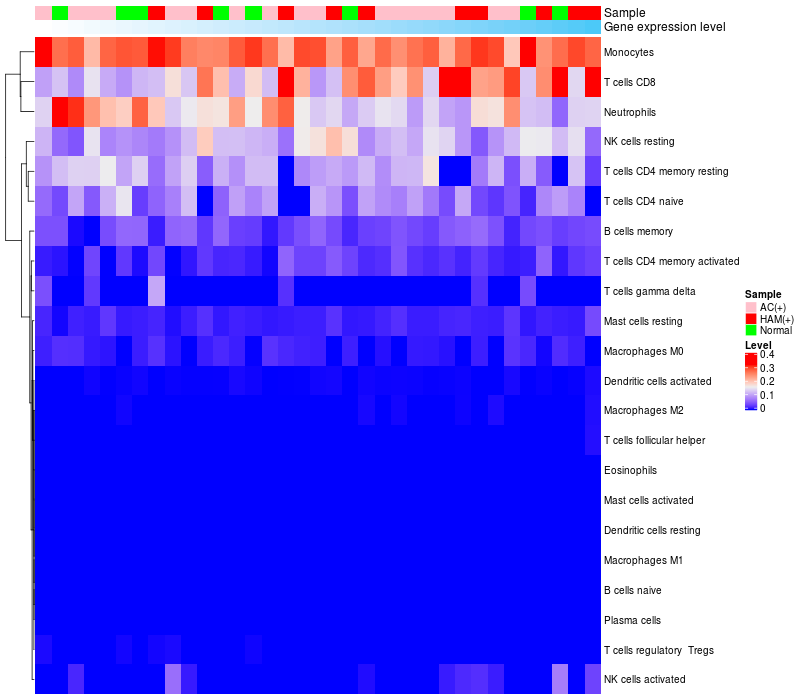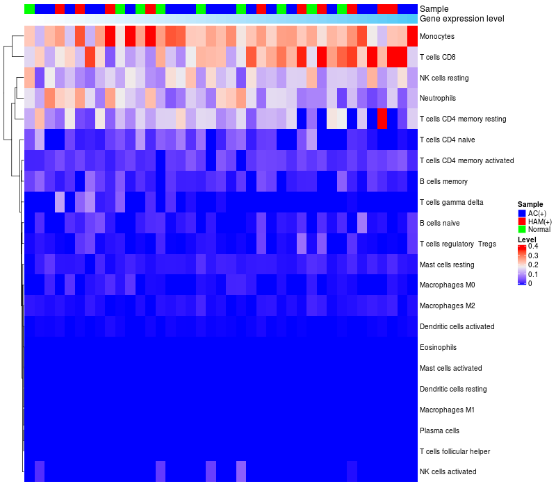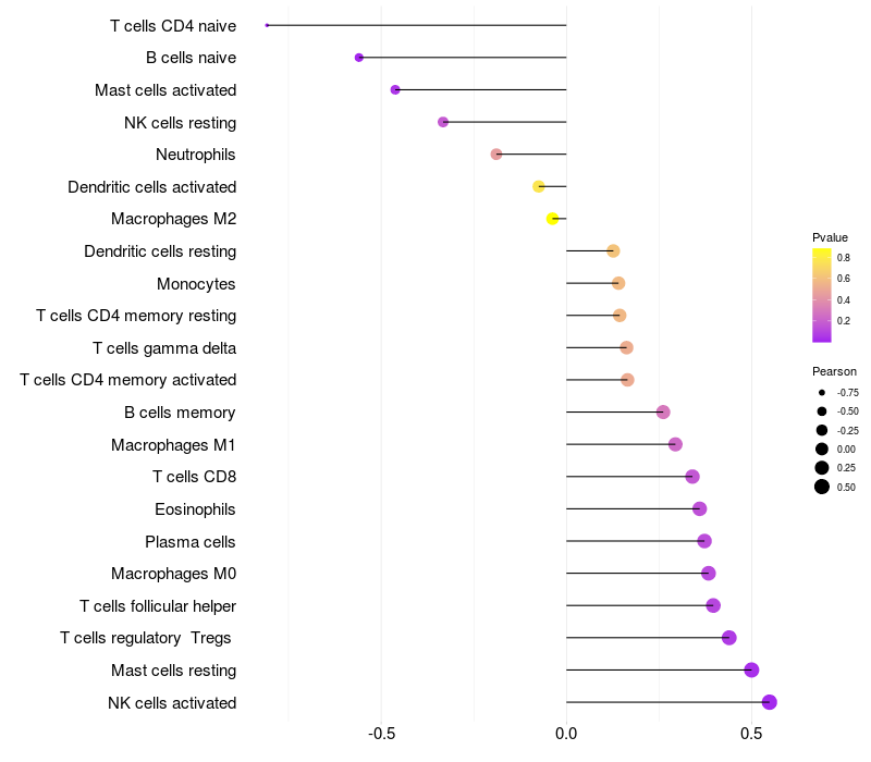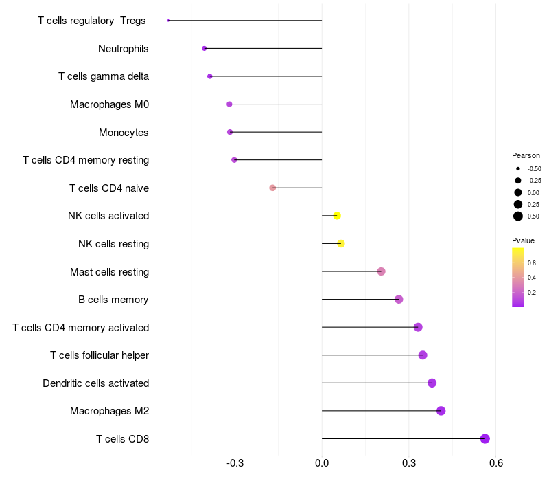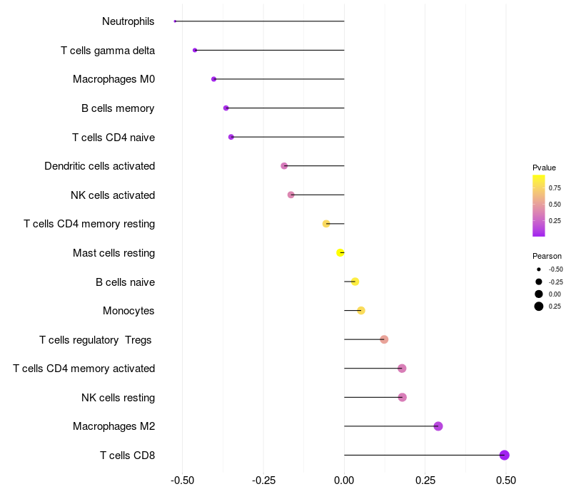 Lollipop of AHNAK expression and immune infiltrating cell level correlation result in HTLV1+ samples