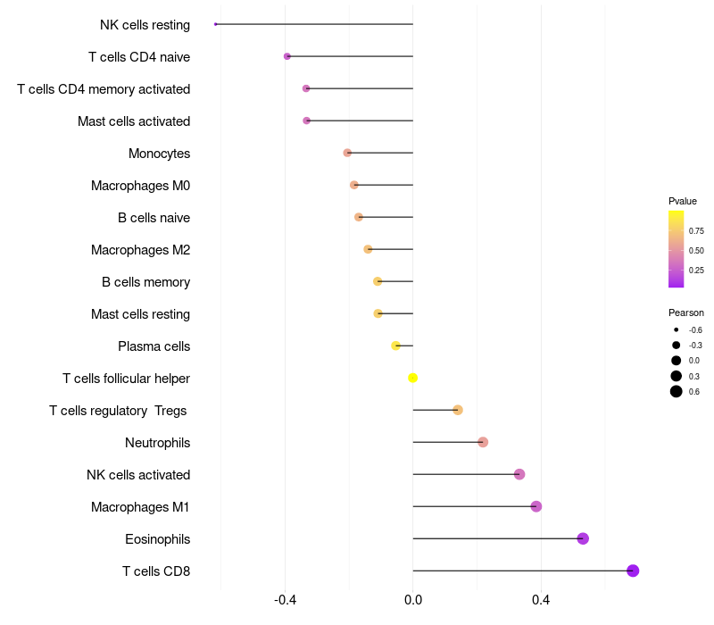 Lollipop of AK1 expression and immune infiltrating cell level correlation result in HBV+ samples