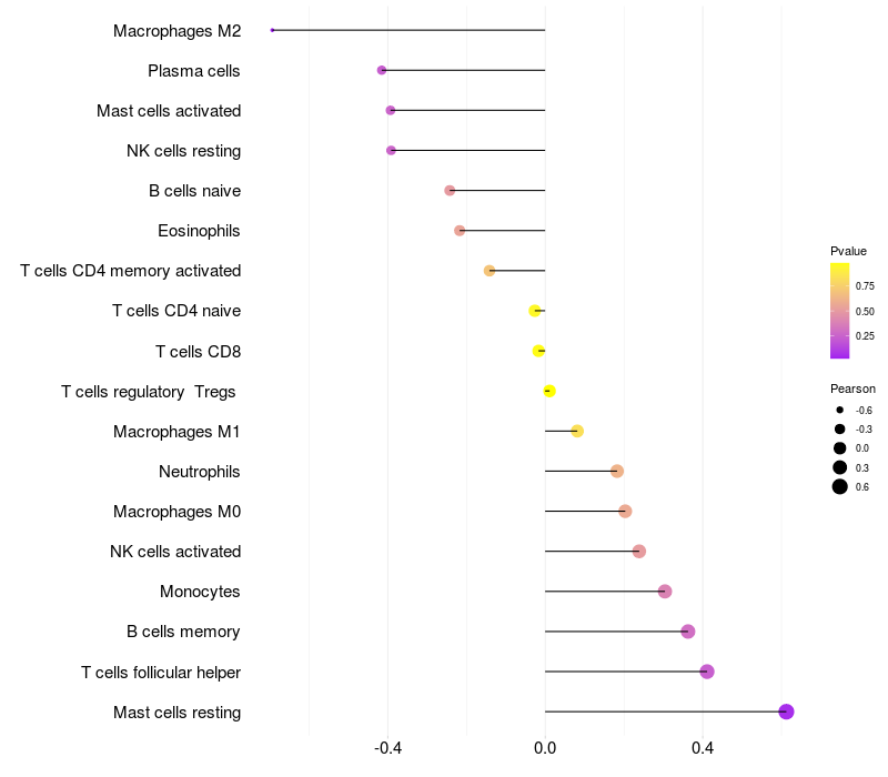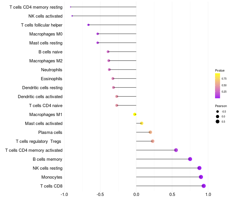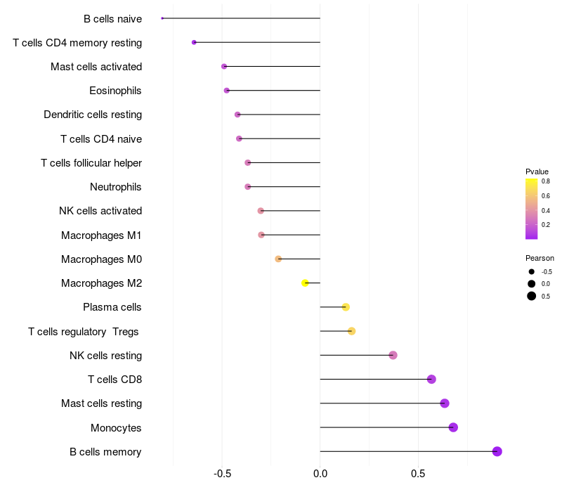 Lollipop of AKAP13 expression and immune infiltrating cell level correlation result in HBV+ samples