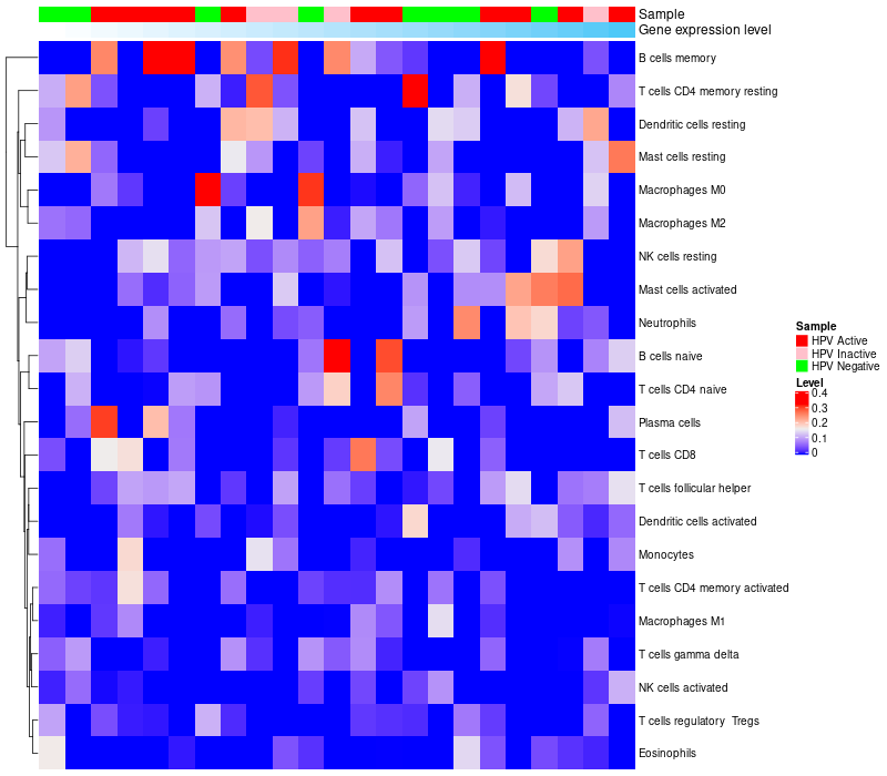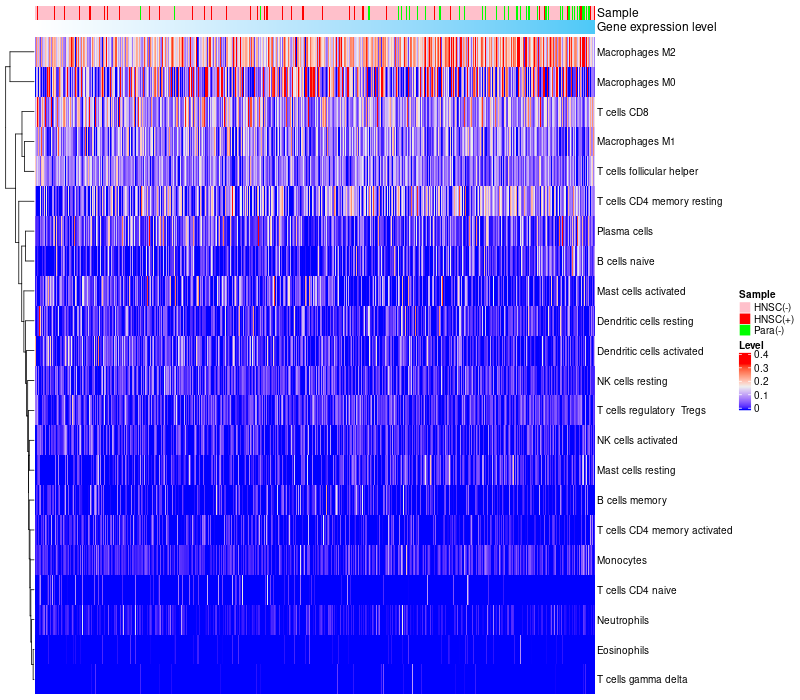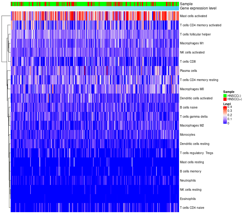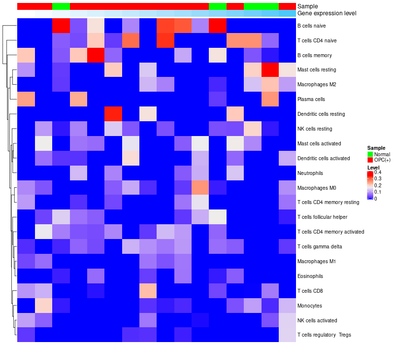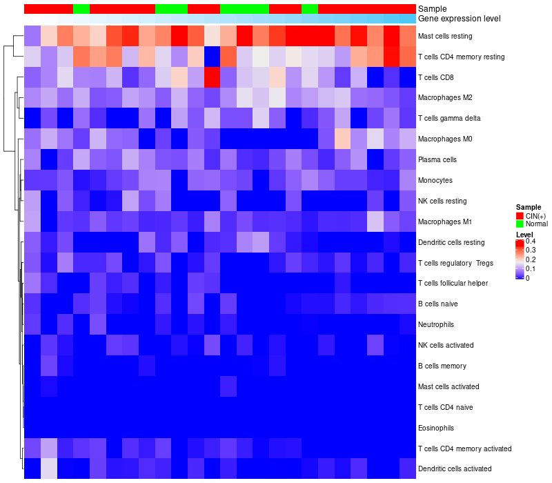 • Left: Heatmap of target gene expression and the level of various types of immune cells (cell type fractions) in all samples based on CIBERSORT method.