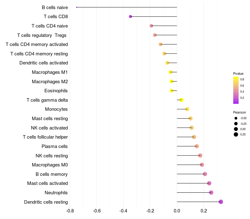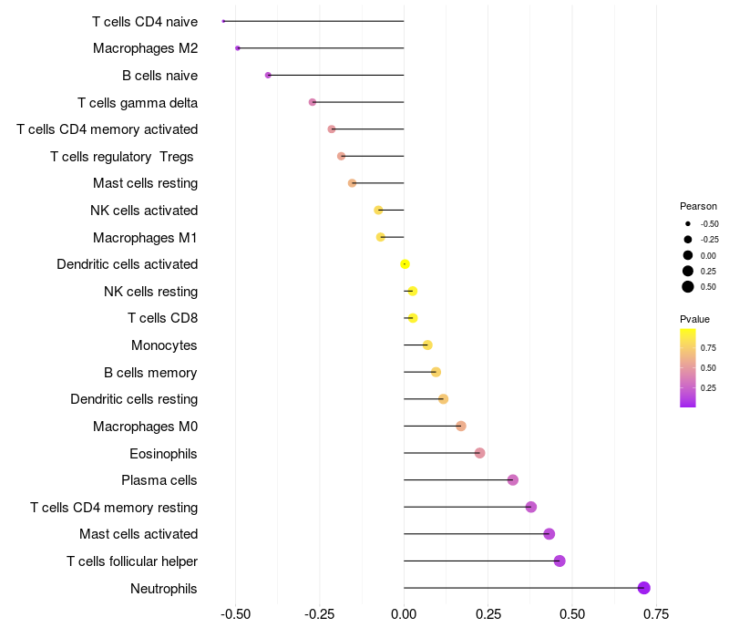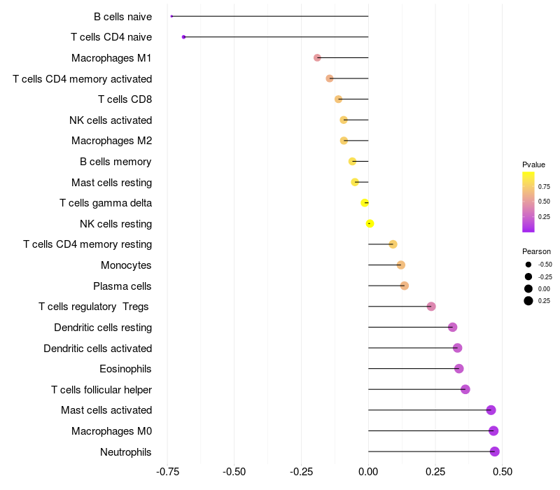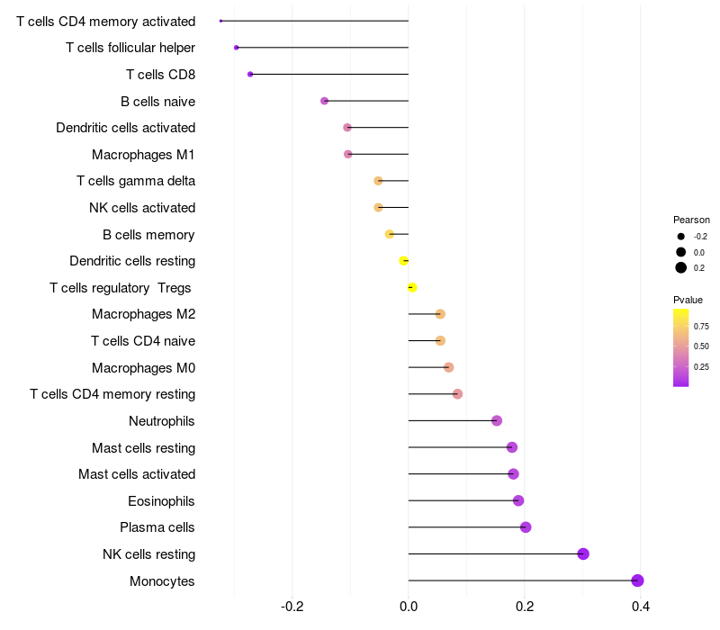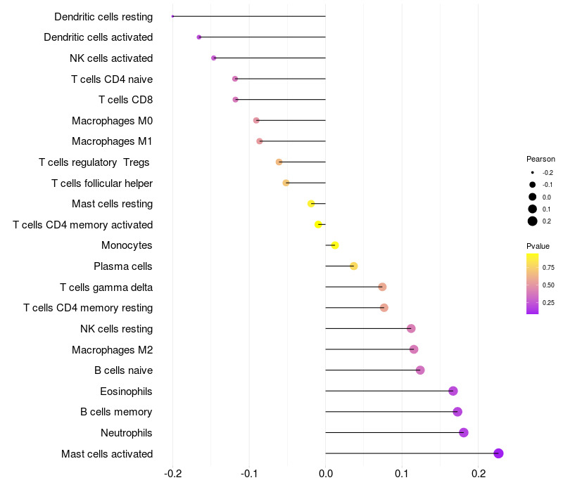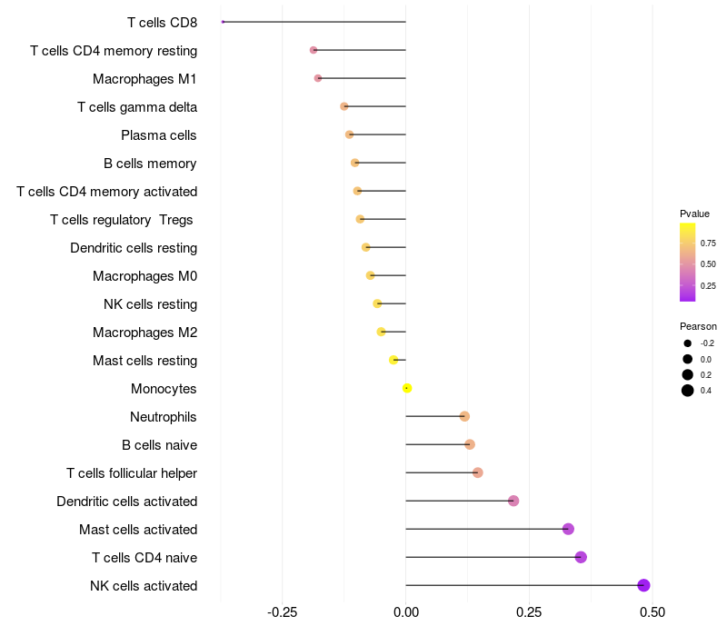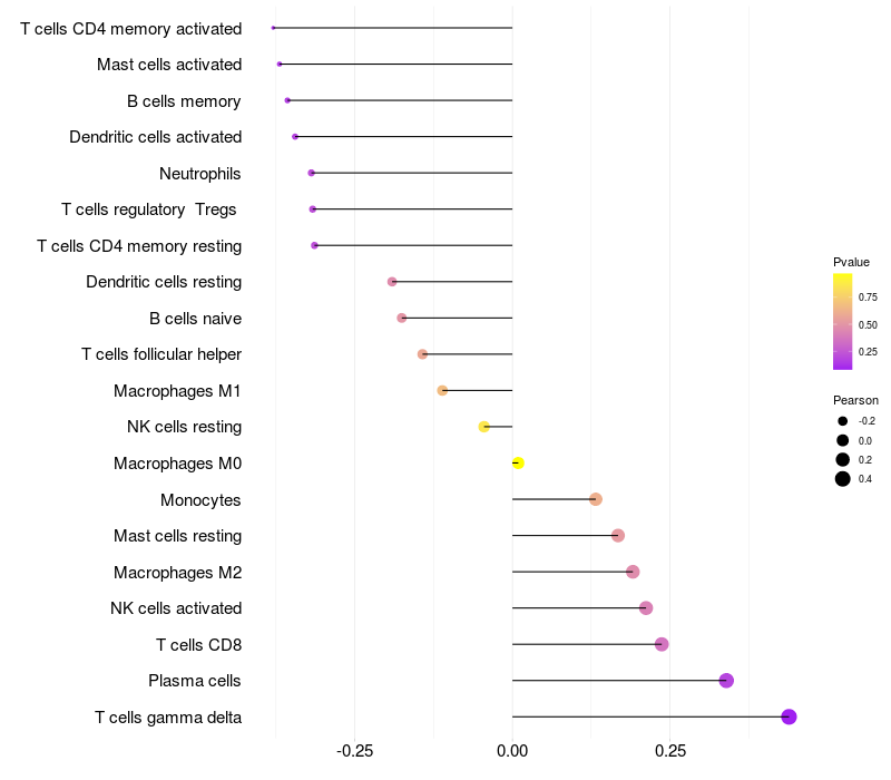 Lollipop of ALDH1A3 expression and immune infiltrating cell level correlation result in HPV+ samples