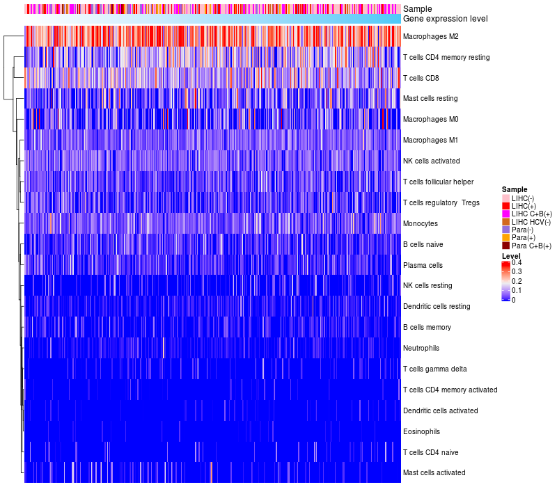 Liver hepatocellular carcinoma HCV (HBV+)(86), Liver hepatocellular carcinoma HCV (HBV-)(19), Liver hepatocellular carcinoma (HBV+)(209), Liver hepatocellular carcinoma (HBV+)(60), Paracancerous HCV (HBV+)(4), Paracancerous (HBV-)(28), Paracancerous (HBV+)(18) |
