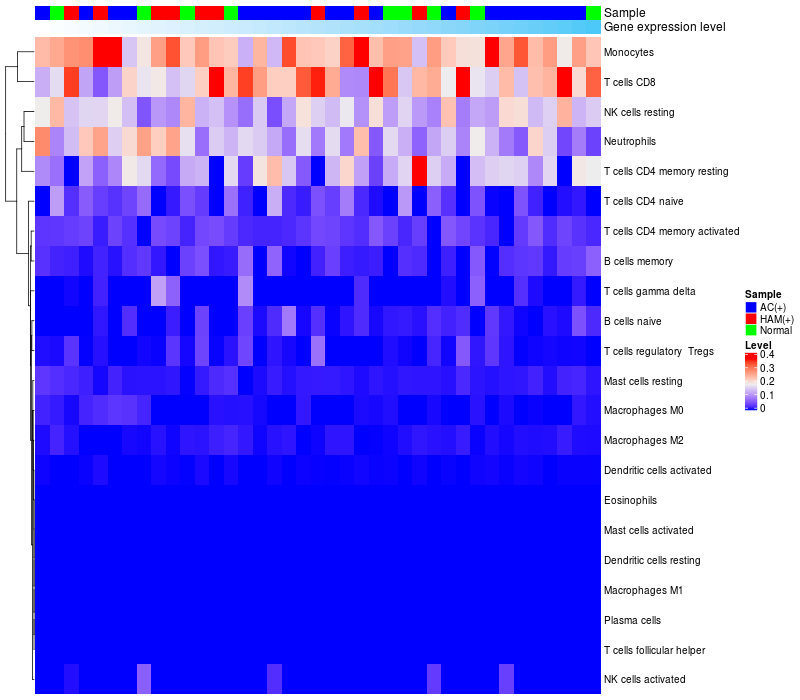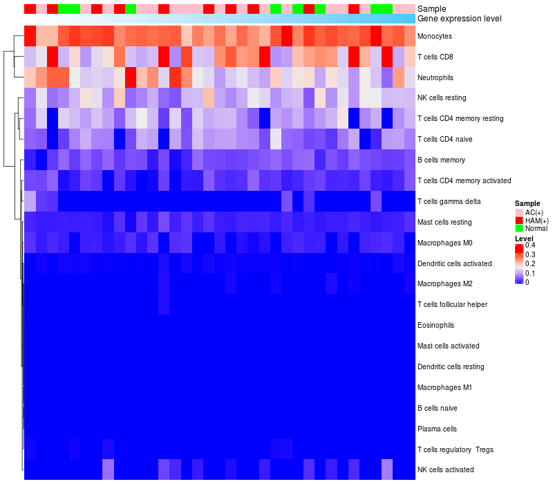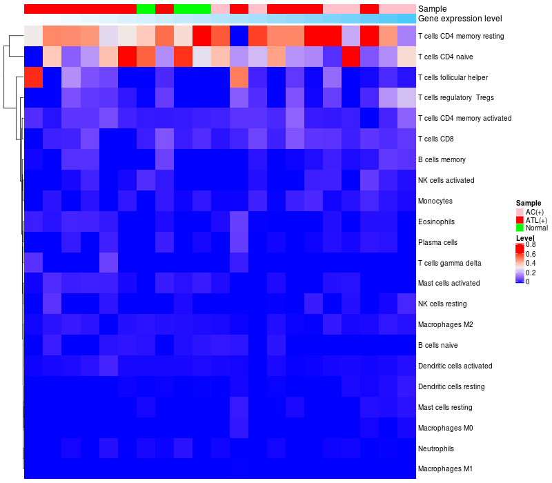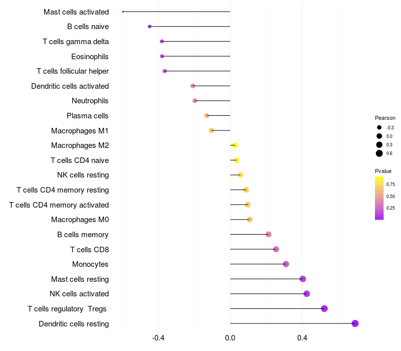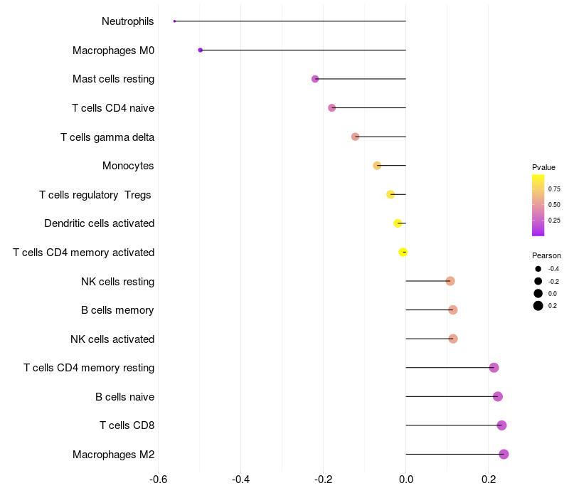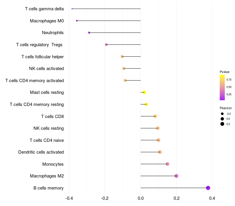 Lollipop of ALKBH4 expression and immune infiltrating cell level correlation result in HTLV1+ samples