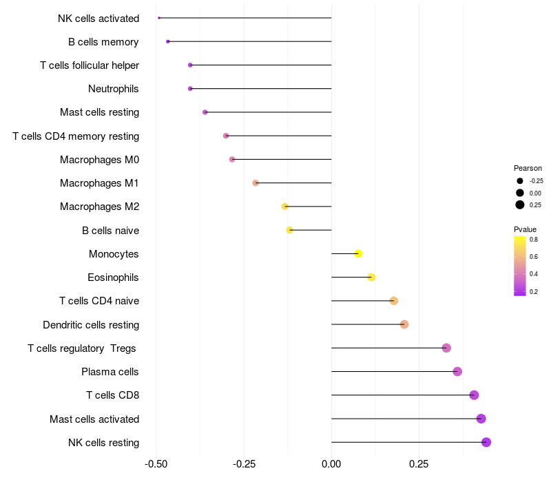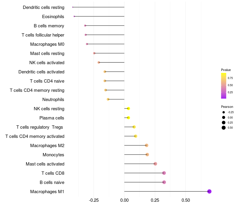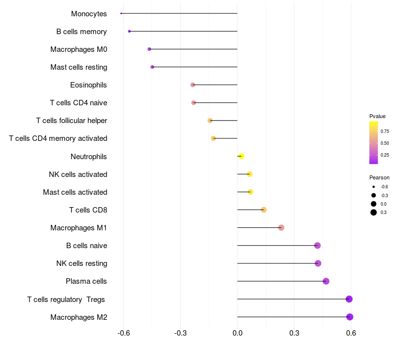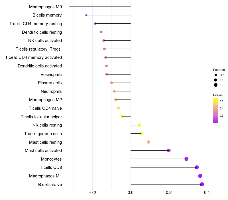 Lollipop of AMBP expression and immune infiltrating cell level correlation result in HBV+ Liver cirrhosis samples