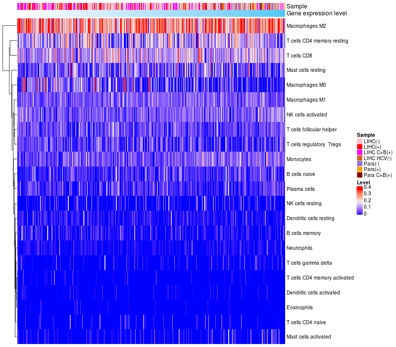 Liver hepatocellular carcinoma HCV (HBV+)(86), Liver hepatocellular carcinoma HCV (HBV-)(19), Liver hepatocellular carcinoma (HBV+)(209), Liver hepatocellular carcinoma (HBV+)(60), Paracancerous HCV (HBV+)(4), Paracancerous (HBV-)(28), Paracancerous (HBV+)(18) |