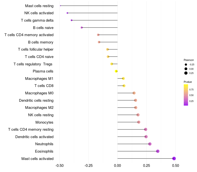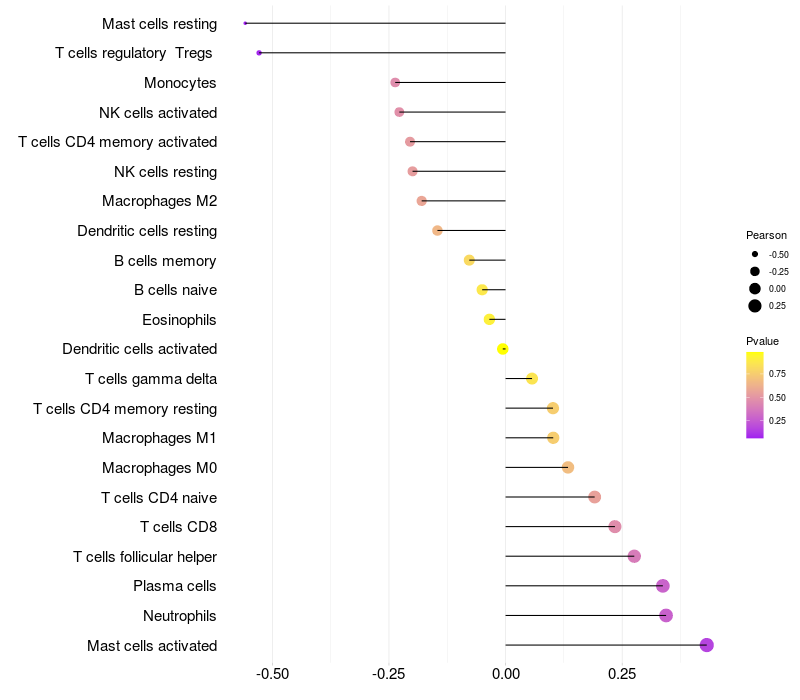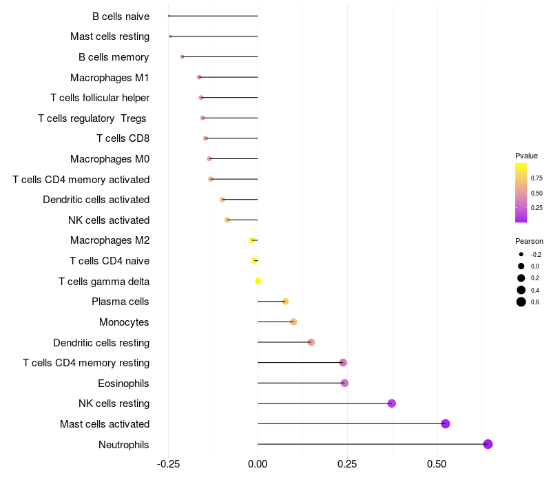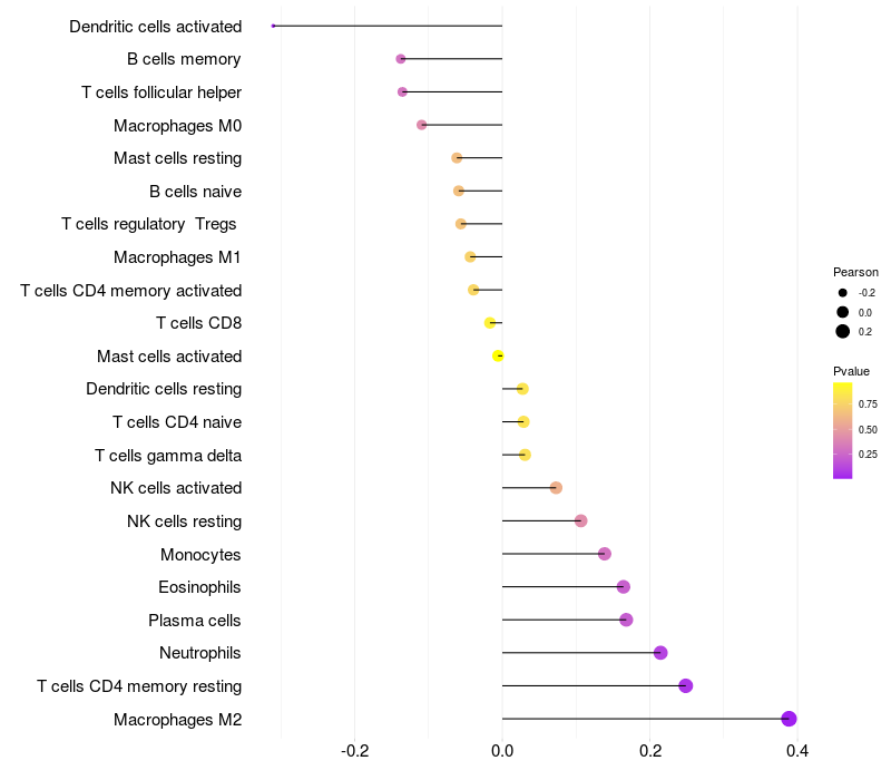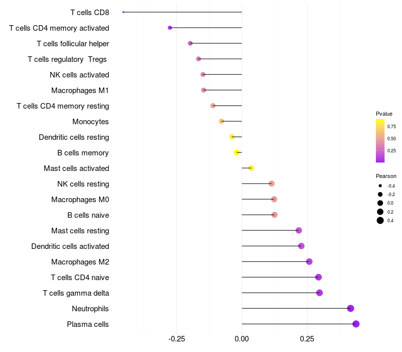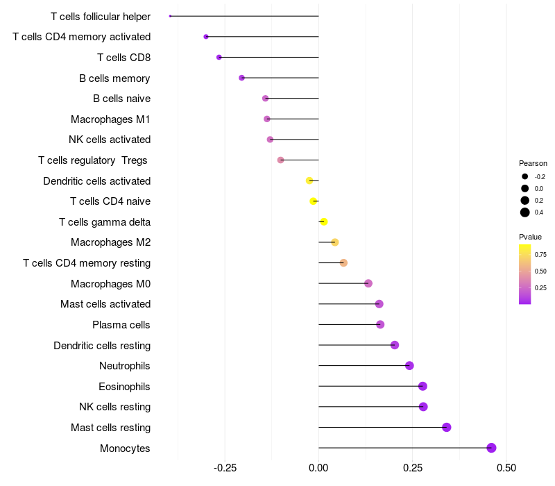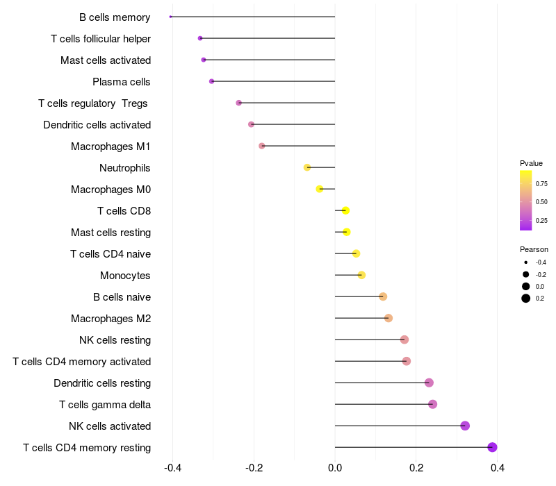 Lollipop of ANO10 expression and immune infiltrating cell level correlation result in HPV+ samples