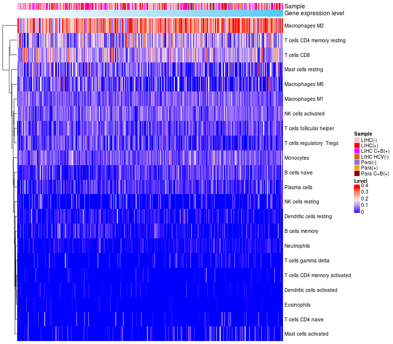 Liver hepatocellular carcinoma HCV (HBV+)(86), Liver hepatocellular carcinoma HCV (HBV-)(19), Liver hepatocellular carcinoma (HBV+)(209), Liver hepatocellular carcinoma (HBV+)(60), Paracancerous HCV (HBV+)(4), Paracancerous (HBV-)(28), Paracancerous (HBV+)(18) |
