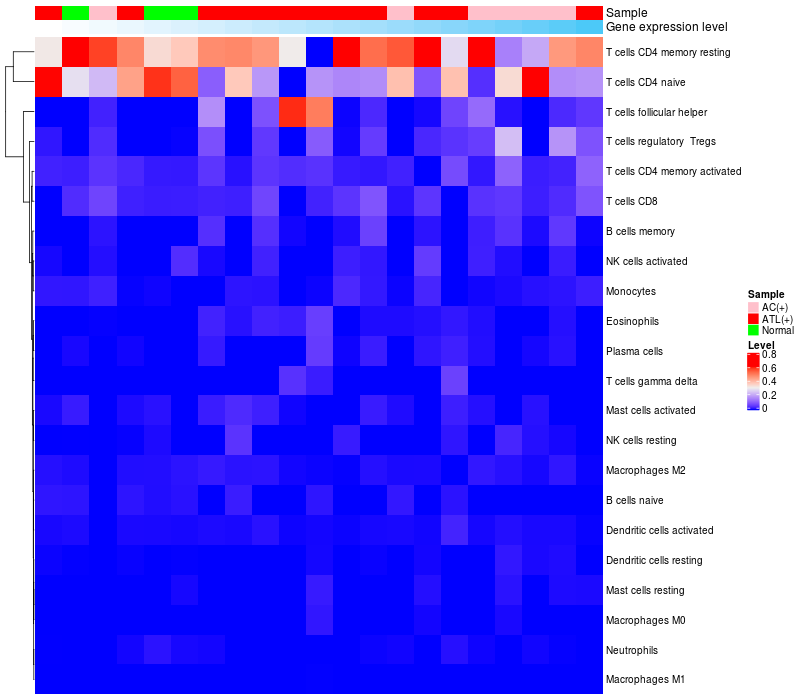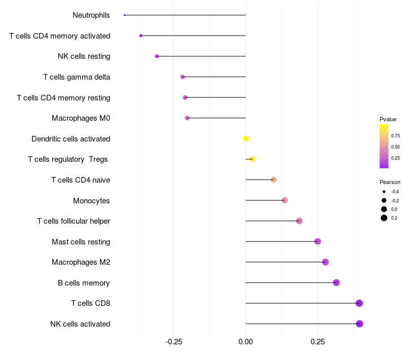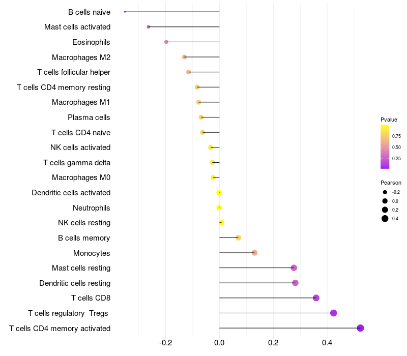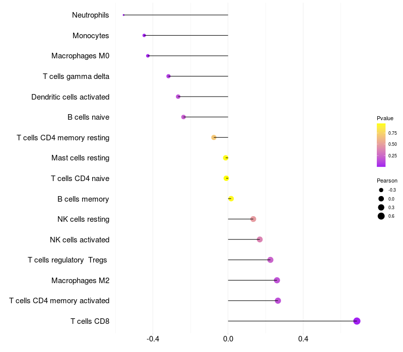 Lollipop of AP4B1 expression and immune infiltrating cell level correlation result in HTLV1+ samples