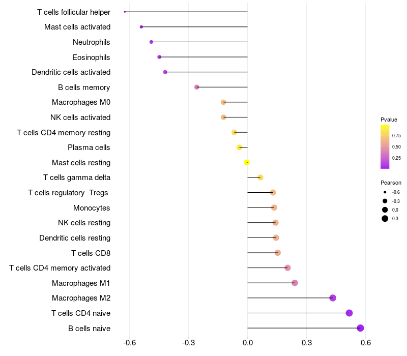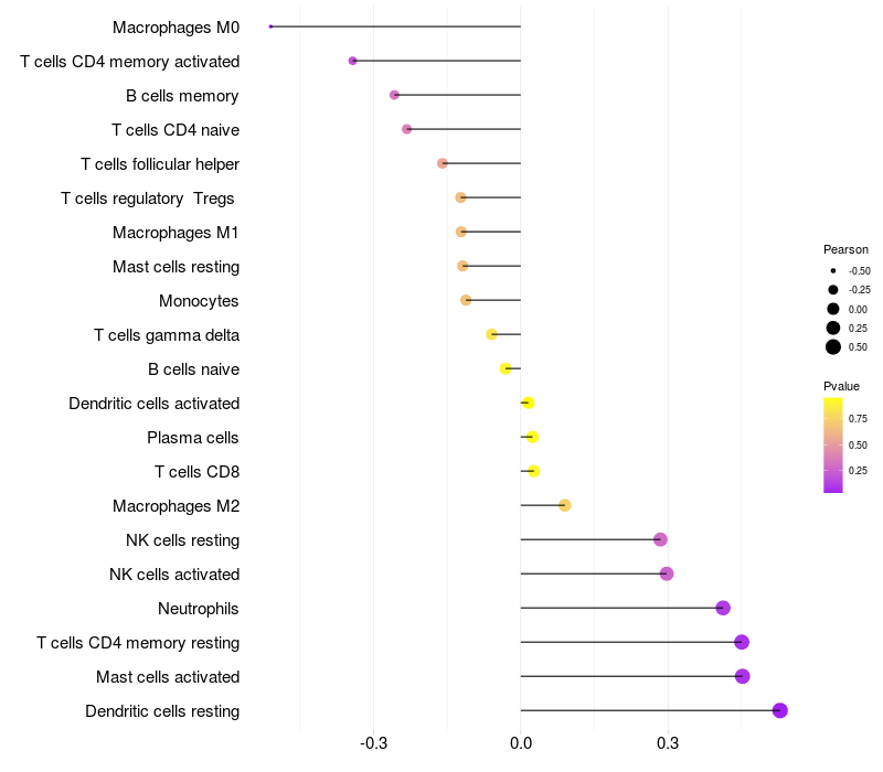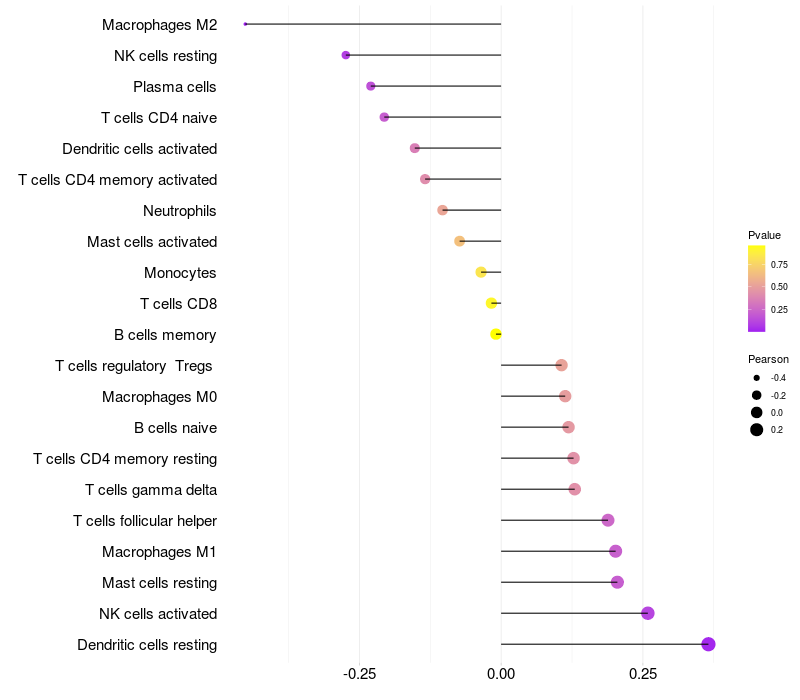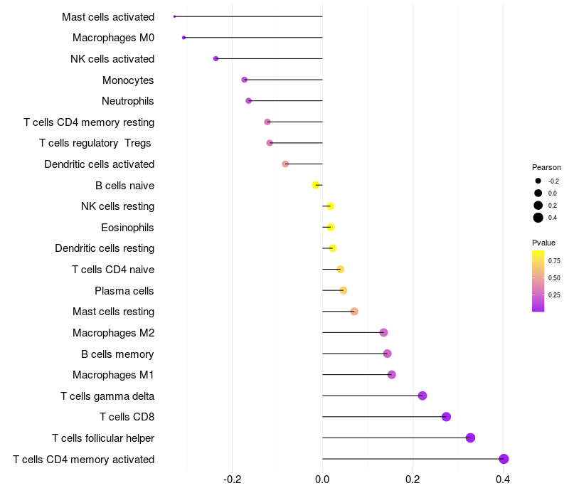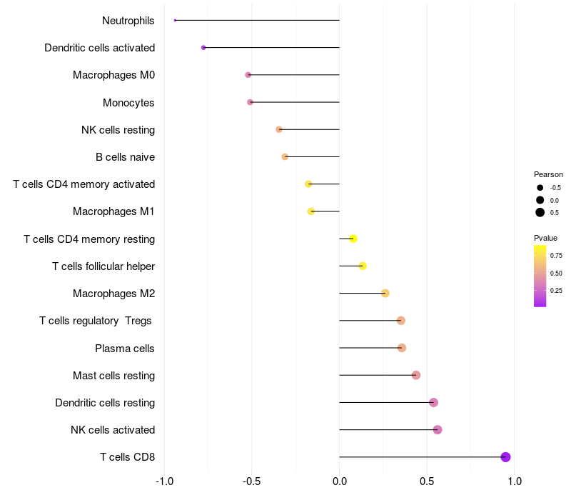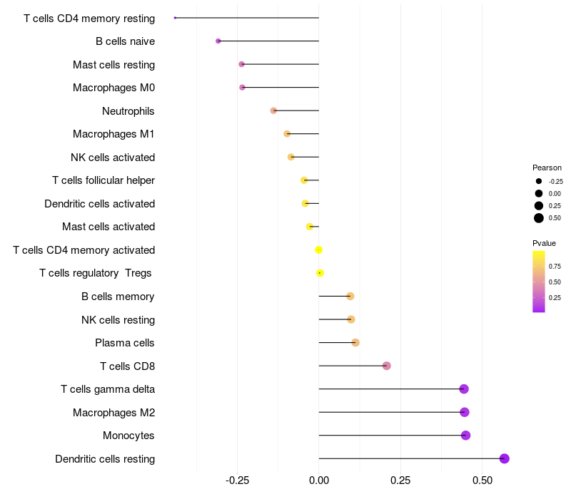 Lollipop of APLF expression and immune infiltrating cell level correlation result in HPV+ samples