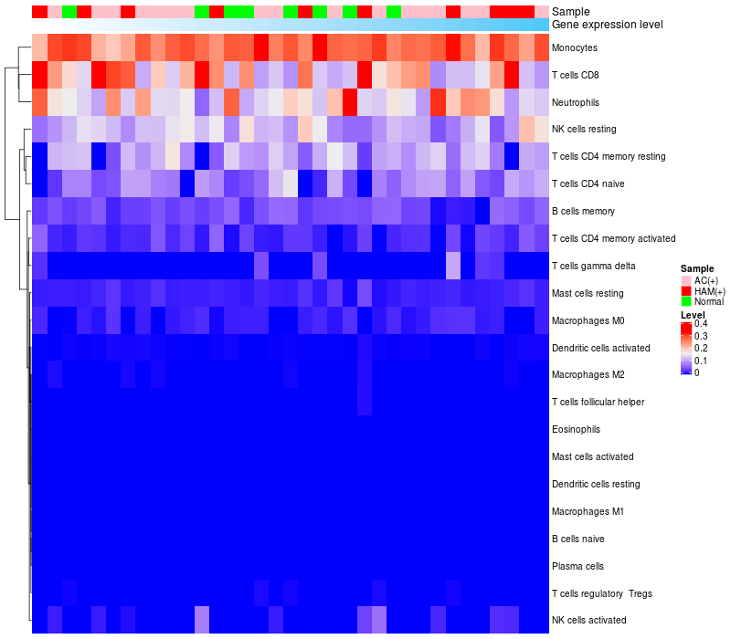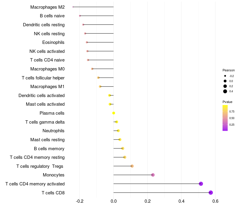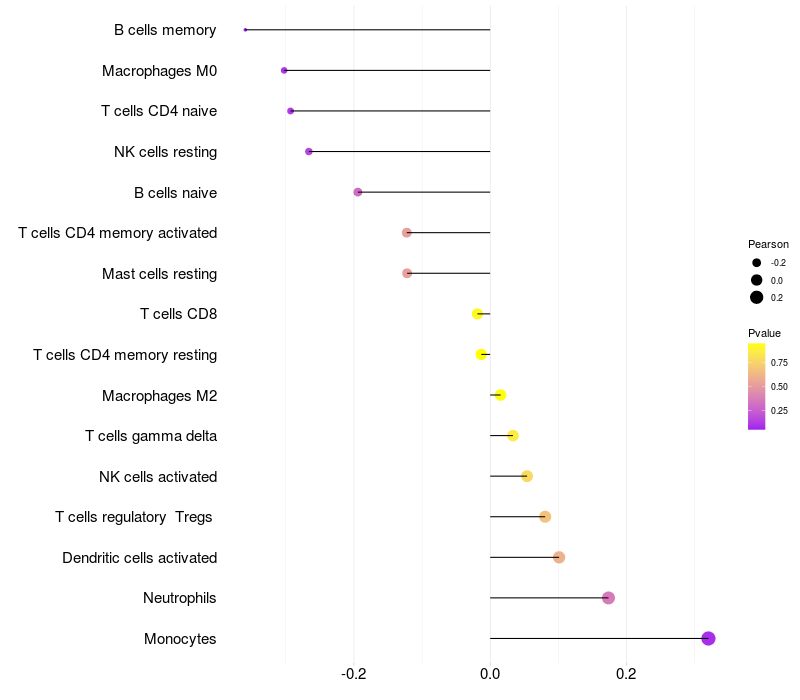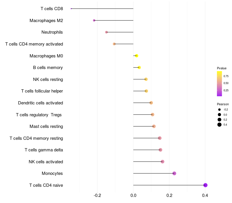 Lollipop of AR expression and immune infiltrating cell level correlation result in HTLV1+ samples