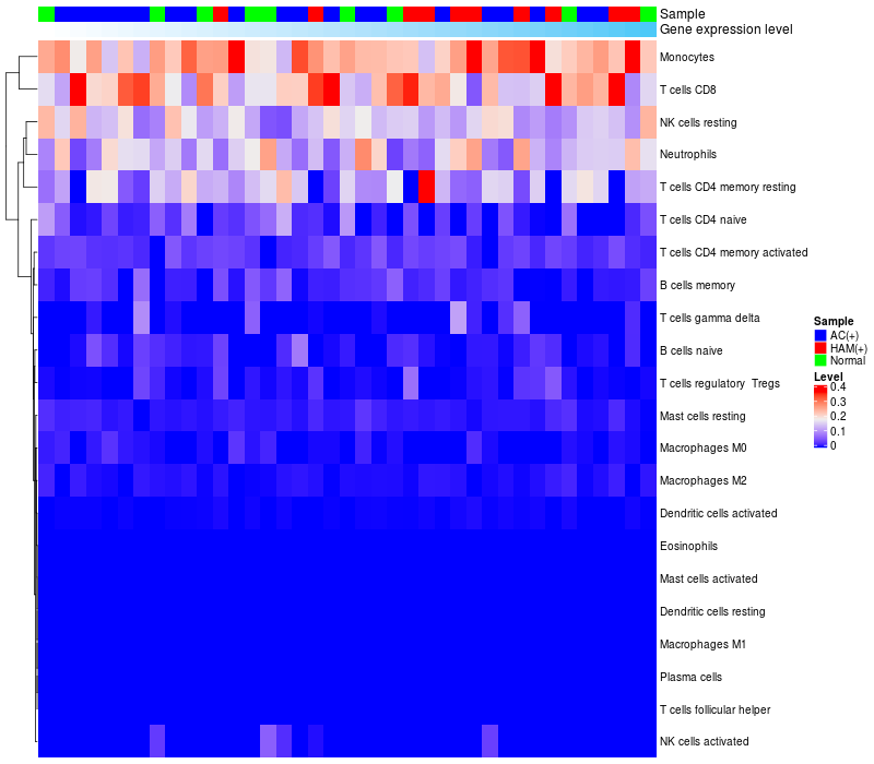 Normal (8), Asymptomatic carriers (HTLV1+)(17), HTLV-1-associated myelopathy (HTLV1+)(10) |