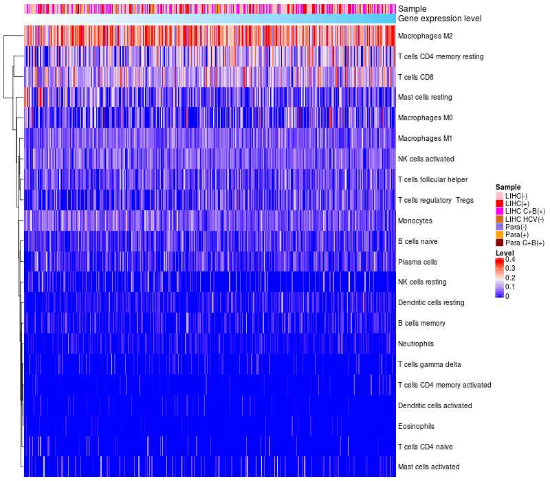 Liver hepatocellular carcinoma HCV (HBV+)(86), Liver hepatocellular carcinoma HCV (HBV-)(19), Liver hepatocellular carcinoma (HBV+)(209), Liver hepatocellular carcinoma (HBV+)(60), Paracancerous HCV (HBV+)(4), Paracancerous (HBV-)(28), Paracancerous (HBV+)(18) |