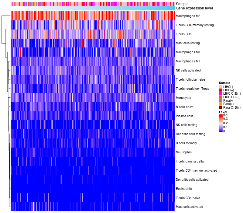 Liver hepatocellular carcinoma HCV (HBV+)(86), Liver hepatocellular carcinoma HCV (HBV-)(19), Liver hepatocellular carcinoma (HBV+)(209), Liver hepatocellular carcinoma (HBV+)(60), Paracancerous HCV (HBV+)(4), Paracancerous (HBV-)(28), Paracancerous (HBV+)(18) |