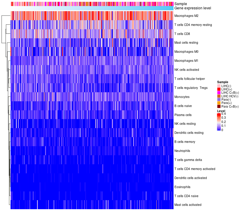 Liver hepatocellular carcinoma HCV (HBV+)(86), Liver hepatocellular carcinoma HCV (HBV-)(19), Liver hepatocellular carcinoma (HBV+)(209), Liver hepatocellular carcinoma (HBV+)(60), Paracancerous HCV (HBV+)(4), Paracancerous (HBV-)(28), Paracancerous (HBV+)(18) |