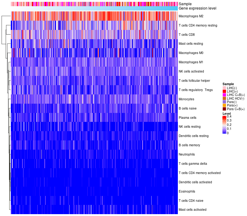 Liver hepatocellular carcinoma HCV (HBV+)(86), Liver hepatocellular carcinoma HCV (HBV-)(19), Liver hepatocellular carcinoma (HBV+)(209), Liver hepatocellular carcinoma (HBV+)(60), Paracancerous HCV (HBV+)(4), Paracancerous (HBV-)(28), Paracancerous (HBV+)(18) |