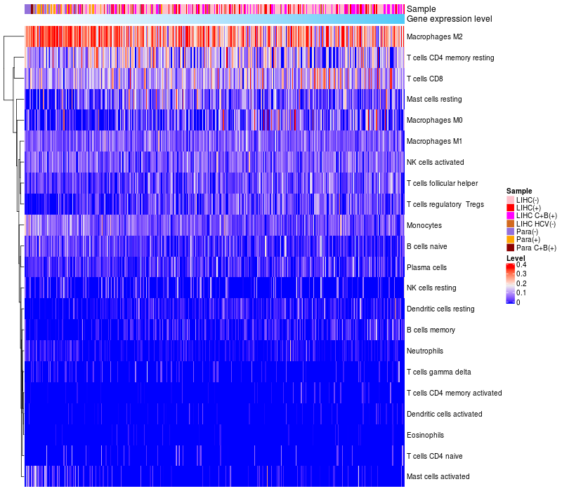 Liver hepatocellular carcinoma HCV (HBV+)(86), Liver hepatocellular carcinoma HCV (HBV-)(19), Liver hepatocellular carcinoma (HBV+)(209), Liver hepatocellular carcinoma (HBV+)(60), Paracancerous HCV (HBV+)(4), Paracancerous (HBV-)(28), Paracancerous (HBV+)(18) |