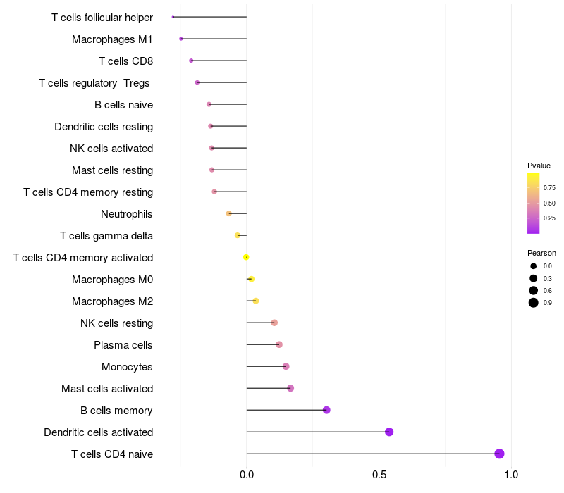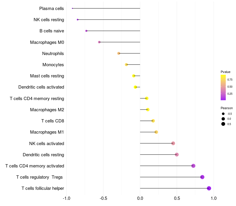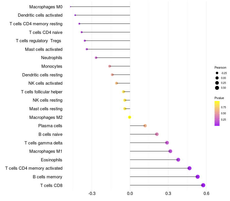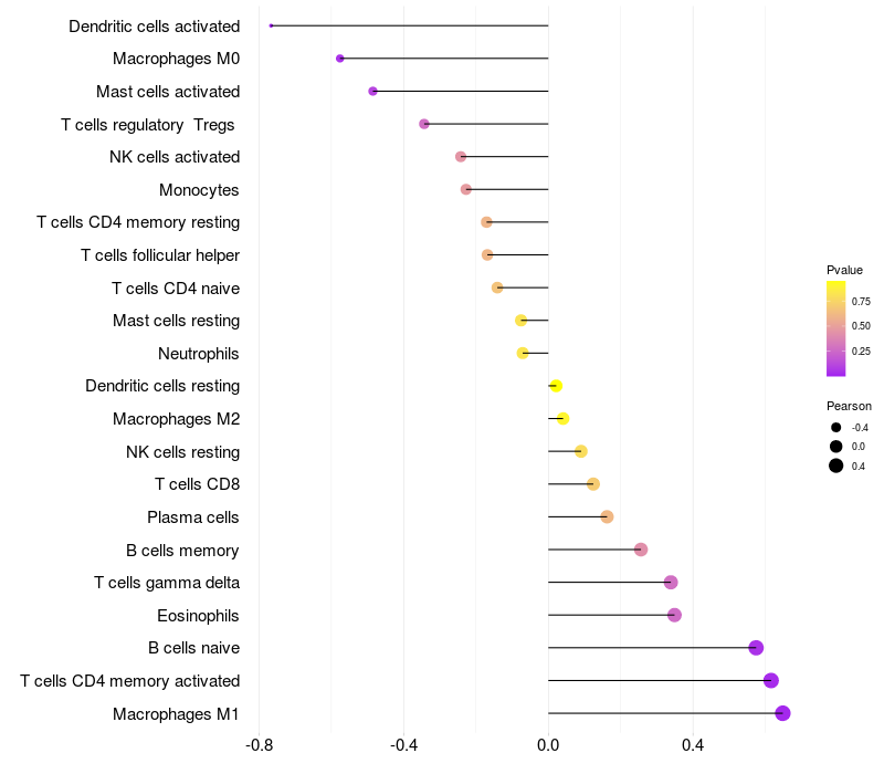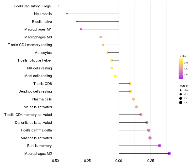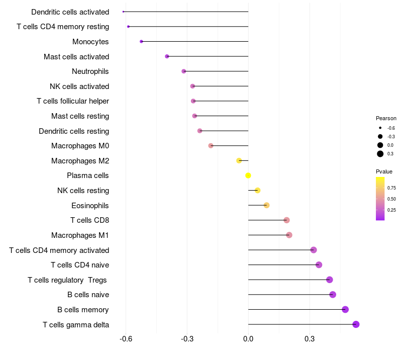 Lollipop of ASMT expression and immune infiltrating cell level correlation result in HPV+ samples